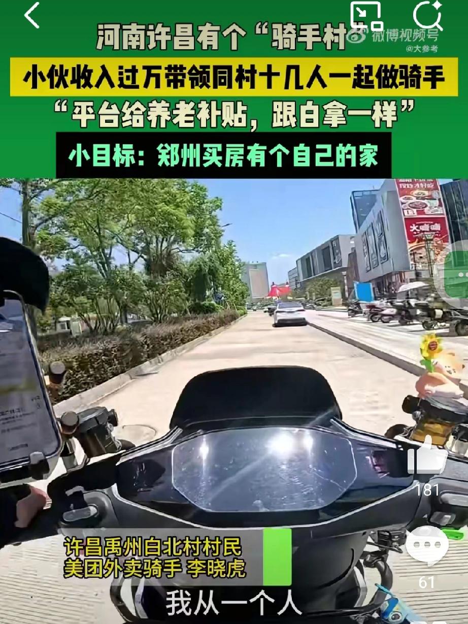 河南“骑手村”的幸福密码:抱团打拼,让日子越跑越稳 河南许昌的一个小村庄,因一群骑手的抱团奋斗走红网络。从最初一人试水外卖行业,到如今近20名同乡追随李晓虎共同打拼,这个“骑手村”用车轮丈量生计,用汗水浇灌幸福,书写了普通人的奋斗篇章。“月入八千打底,旺季能破万,公司还补贴一半养老保险”,朴实的话语里,藏着最实在的安稳与期盼。 “骑手村”的崛起,藏着底层劳动者的生存智慧。有人为补贴家用,有人为积累创业资本,不同的初衷却指向相同的奋斗目标——靠踏实肯干改善生活。外卖行业低门槛、多劳多得的特性,为他们提供了公平竞争的舞台;而同乡结伴的模式,不仅化解了独自闯荡的孤独,更形成了互帮互助的默契,让奔波的路不再孤单。 更让人暖心的是企业的保障加持。养老保险补贴看似小事,却为骑手群体筑牢了“安全感”,让这份“灵活就业”不再是“漂泊无依”。当勤劳付出能换来可观收入,当奔波打拼能获得权益保障,劳动者的获得感自然油然而生。这也印证了:幸福从不是空想而来,而是政策托底、企业赋能与个人奋斗的双向奔赴。 “骑手村”的故事,是无数普通人奋斗的缩影。它告诉我们,幸福没有固定模板,无论是写字楼里的白领,还是穿梭街巷的骑手,只要心怀梦想、脚踏实地,就能在平凡的岗位上跑出属于自己的精彩。这份“稳稳的幸福”,既源于同乡同心的抱团力量,更来自于用双手创造未来的笃定与坚持,值得每一个人为之点赞。