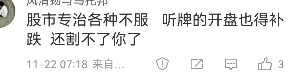 上周五大阴线,你说一步到位了他不信,胡说八道的反倒还有人给他点赞。当然,他们人多。等着下个月让他看看听牌的表现,好消息是他们手里没有听牌的。