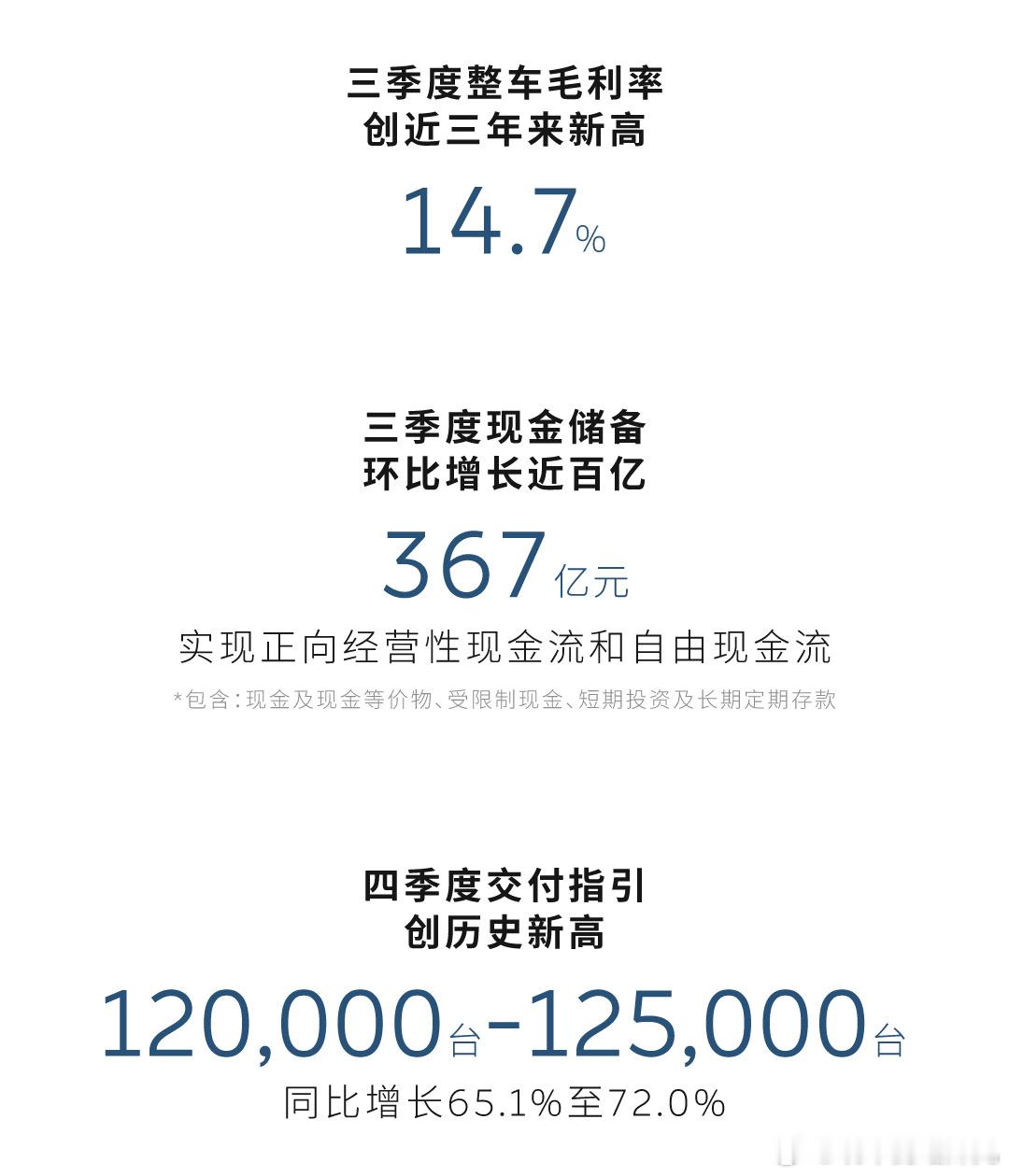 蔚来2025年三季度财报蔚来2025 Q3财报直接交出满分答卷——交付8.7万台同比暴涨40.8%,营收冲217.9亿同比涨16.7%,两项核心数据全破历史纪录!更狠的是综合毛利率飙到13.9%、整车毛利率14.7%,近三年最高水平坐实盈利爆发力。现金储备狂囤367亿环比多拿百亿,正向现金流直接焊死安全线!四季度更放狠话:交付剑指12-12.5万台、营收冲刺327.6-340.4亿元,同比增幅最高达72.8%,又是要刷爆纪录的节奏大v聊车