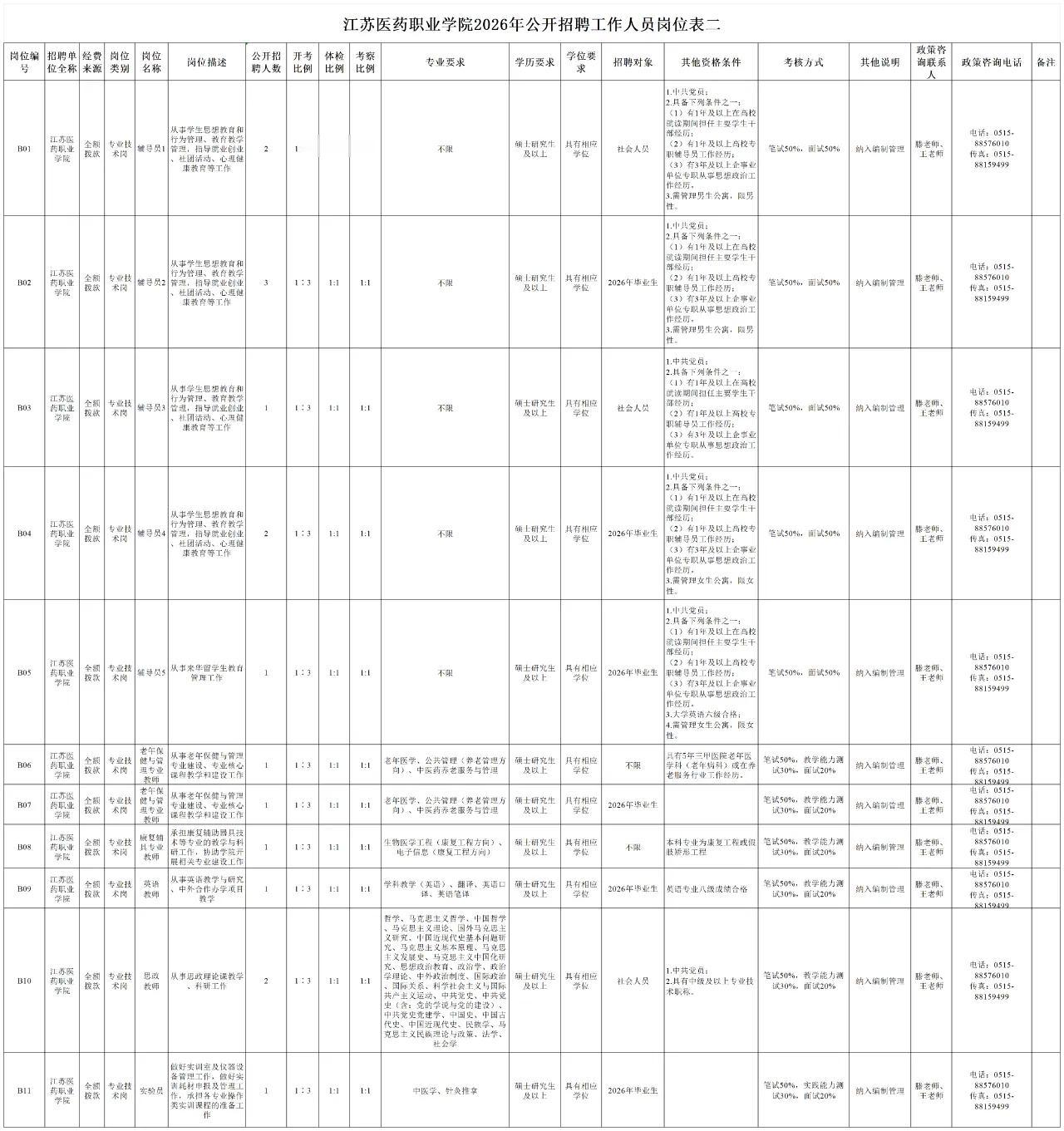 江苏盐城:江苏医药职业学院2026年公开招聘公告 江苏医药职业学院是江苏省卫生健康委员会主管的全额拨款事业单位,根据《江苏省事业单位公开招聘人员办法》(苏办发〔2020〕9号)精神,为更好地选拔优秀适岗人才,充实人才队伍,优化师资结构,江苏医药职业学院现面向社会公开招聘优秀人才。 报名方式:网上报名或现场报名岗位表一 报名时间:2025年11月26日9:00—2026年3月25日16:00岗位表二 报名时间:2025年11月26日9:00—12月3日16:00。