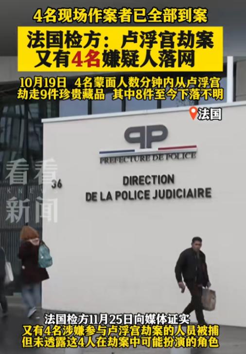 卢浮宫那起让全网惊呼“现实版劫案”的大瓜最新进展直接刷屏,11月25日最后4名涉案人员被警方一锅端,8个嫌犯总算全蹲局子了,可揪心的是被抢的8件百年珍宝,至今还是没半点消息。 这事得倒回10月19号,4个蒙面狠人是真胆大包天,穿黄马甲装成施工工人,借着卢浮宫外墙施工的围挡当掩护,架起升降装置就往阳台钻。 前后才7分钟,用角磨机“咔嚓”砸烂展柜,抢走9件拿破仑时期的宝贝疙瘩,全是传了上百年的王室顶级藏品! 结果跑的时候慌不择路,把欧仁妮皇后的皇冠掉在了现场,还想纵火毁了作案用的摩托车和工具,幸亏被工作人员及时拦住。 而出事后卢浮宫直接关门直到10月22号才敢重新对外开放。 咱得说警察破案是真给力!从现场摩托车和展柜玻璃上抠到的DNA,直接锁定嫌犯身份,10月25号先拿下俩现场动手的,一个是阿尔及利亚籍,另一个还是有盗窃前科的“惯犯”。 之后11月1号又揪出来一男一女,昨天更狠不光抓了最后一个直接作案的,还顺带逮了2男2女关联人员,就是检方嘴跟焊死了似的,没说这4人到底在案子里扮演啥角色。 可这安保漏洞也太离谱了,卢浮宫号称有5000个摄像头、顶级安防系统,结果施工区成了监控盲区,劫匪大白天溜进去都没人发现。 现在人是抓齐了,但8件珍宝的下落还是个谜,专家说这些带王室标记的珠宝不好销赃,可也怕被坏人拆成碎钻毁掉。