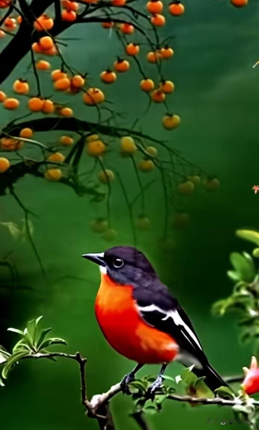一张图证明秋天来了这是秋枝间的一隅:橙黄的小果缀满柔条,像揉碎的日光坠在梢头,晕开暖融融的秋意。那鸟羽色浓烈,赤腹如霞,黑翼嵌着白纹,伶仃立在细枝上,似要衔走这一季的明艳。绿意未褪尽,却已裹了层秋的温软——风该是轻的,裹着果的甜香,连空气都浸着不灼人的暖,是秋最妥帖的模样。