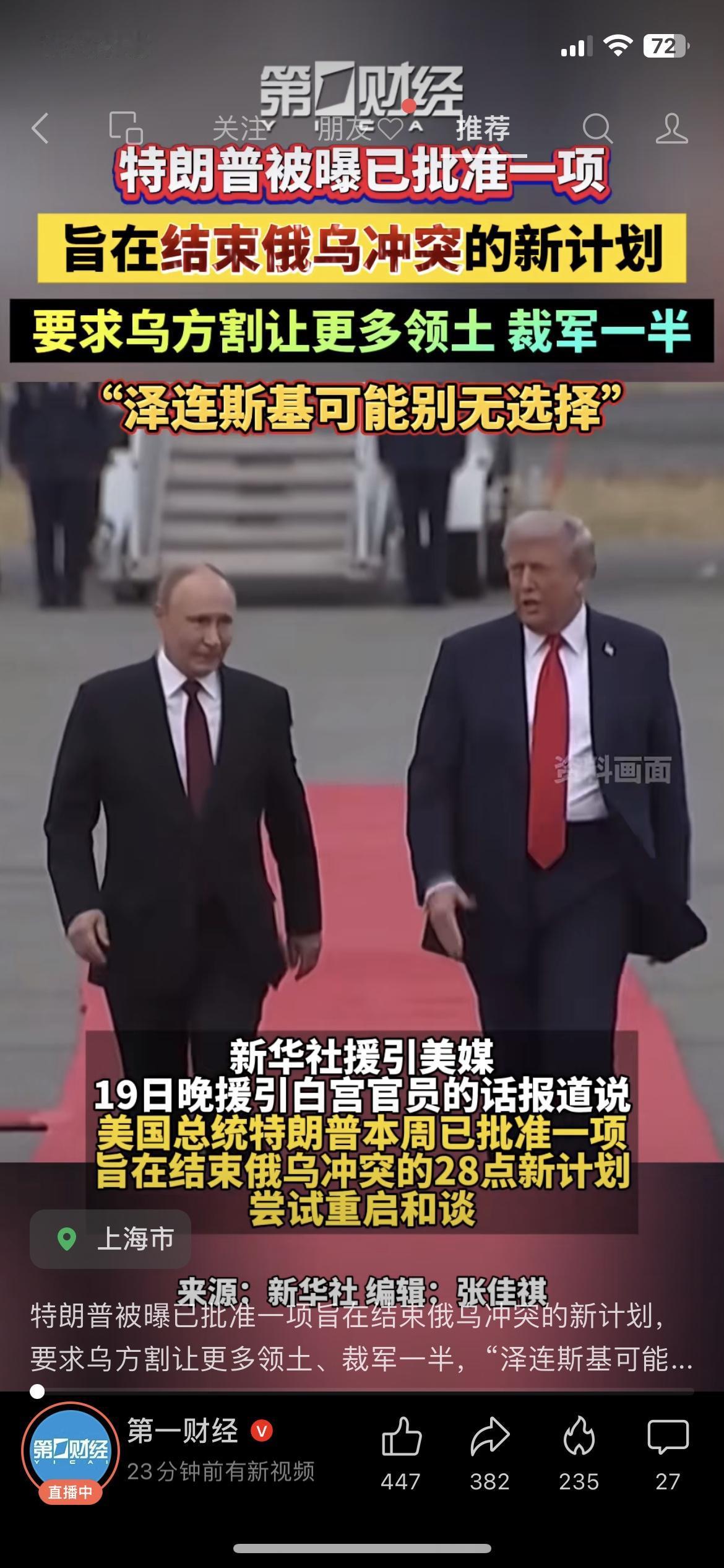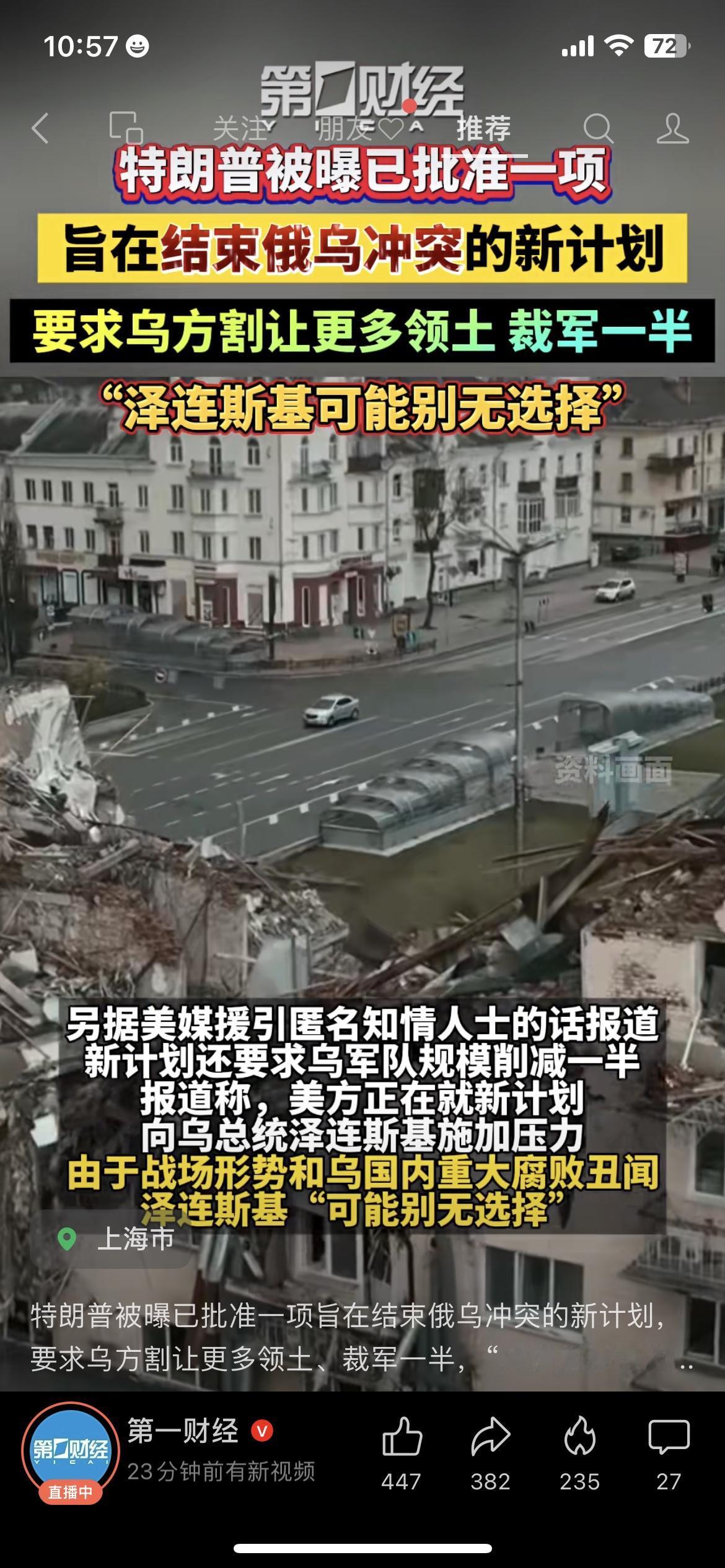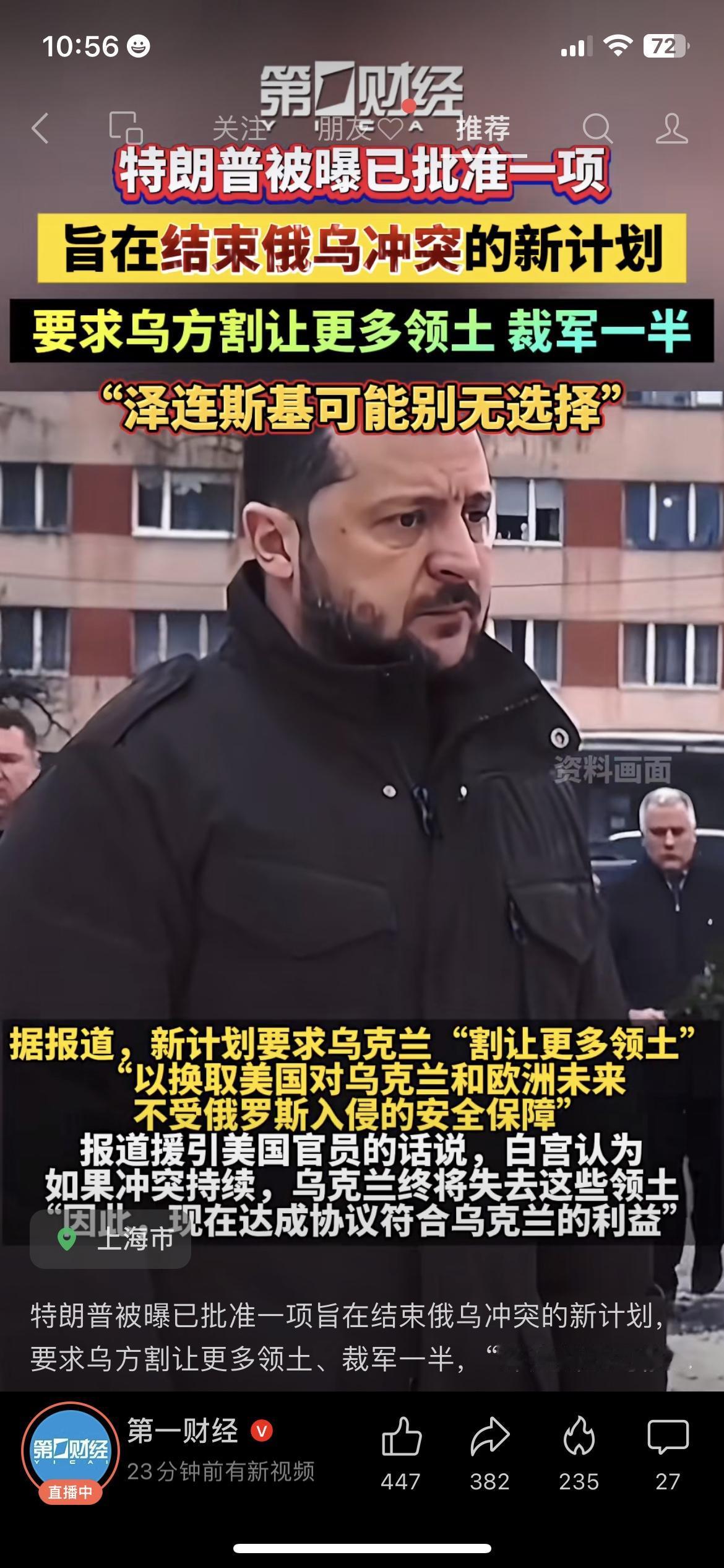 特朗普这波操作是真敢想啊! 刚被曝批了个结束俄乌冲突的计划:要乌方割更多领土、裁军一半,还说泽连斯基“可能别无选择”…这条件放出来,乌方能认吗? 不过现在战场形势+乌内部问题,这事儿到底能不能成,估计得看各方怎么掰扯了。 俄乌冲突 特朗普 国际局势聊特朗普 特朗普发难