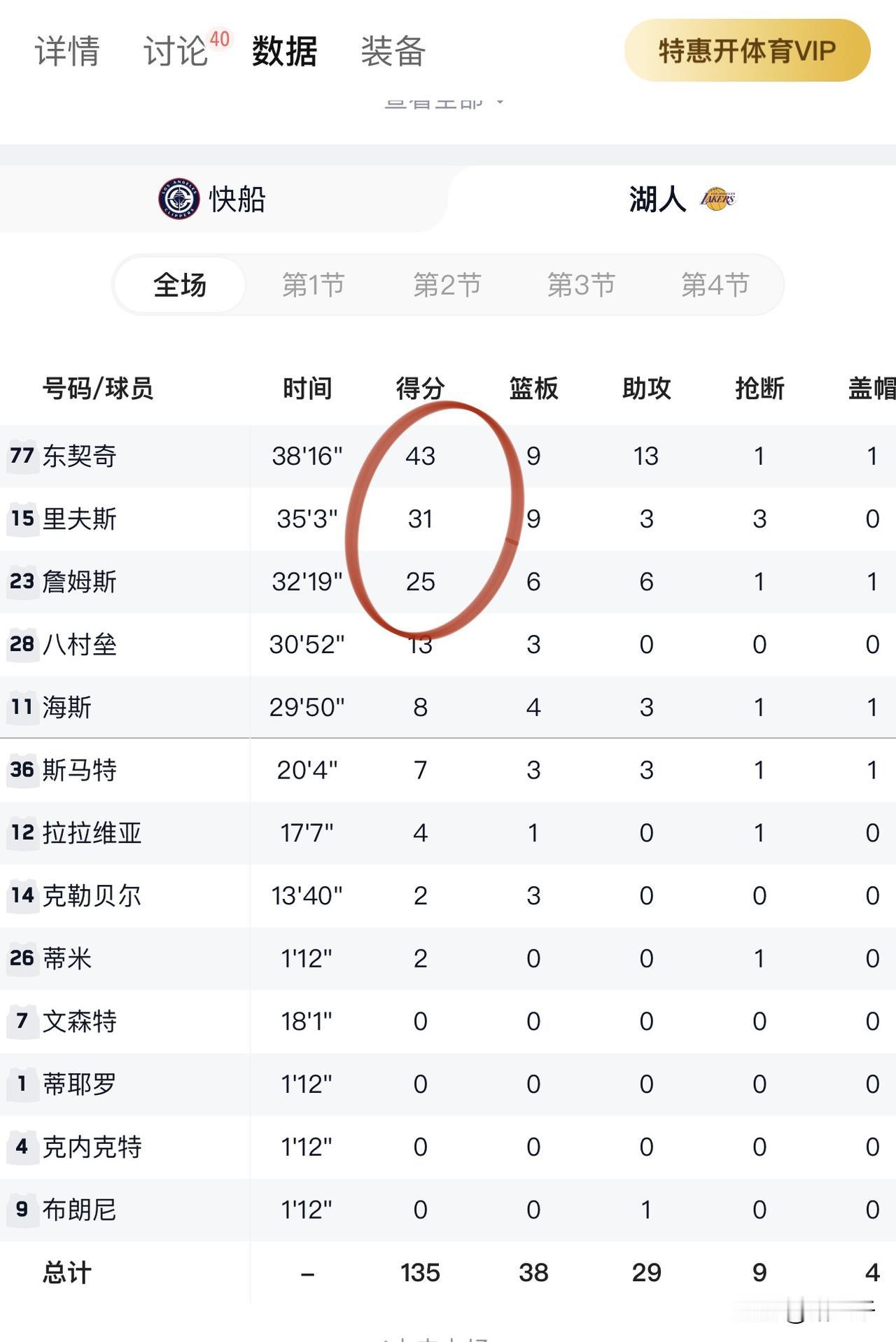 洛杉矶德比大战, 湖人135-118击沉快船, 前面三节两支球队有来有往交替领先。 第四节湖人打出主场气势, 特别是角色球员海斯有事是真上, 在球队一哥东契奇遭遇快船邓恩羞辱性球射胸脯的一瞬间,海斯二话没说直接上! 最终湖人三巨头豪取99分, 艾顿因伤缺阵。 快船每况愈下的战绩, 估计球队分崩离析不远了。 盘点小卡莱昂纳德的历年战况, 几乎是半养退模式, 而哈登和保罗又是冠军绝缘体, 快船本赛季要么交易、要么打散重建。 …