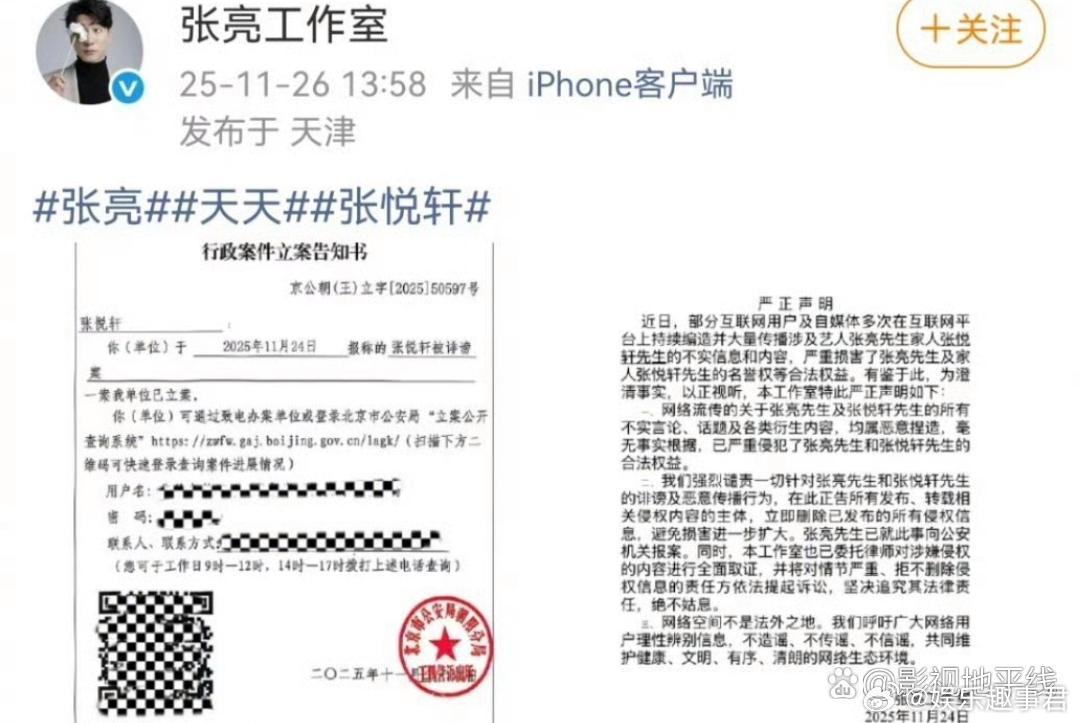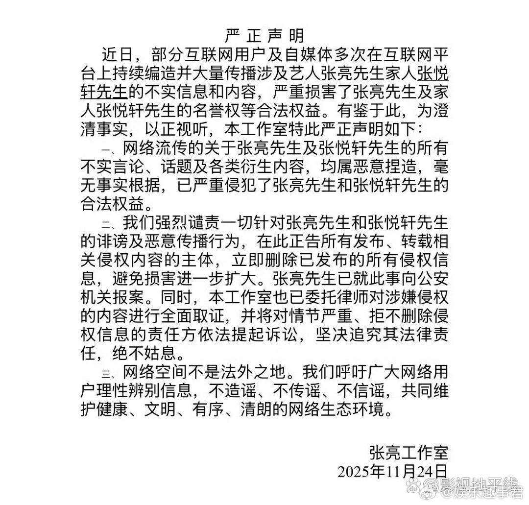 近日,部分互联网用户及自媒体多次在互联网平台上持续编造并大量传播涉及艺人张亮先生家人张悦轩先生的不实信息和内容,严重损害了张亮先生及家人张悦轩先生的名誉权等合法权益。