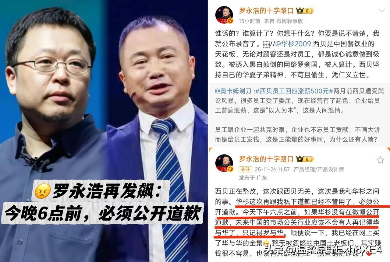 全网都在等华与华道歉 可西贝的事情不是都结束了嘛 这是为何又闹起来了呢?起因是一位大V为西贝说了几句好话,结果华老板就阴阳上了“西贝被诱入黑白颠倒的网络罗刹国,被人算计” 罗永浩一看就来火了,当即就发文质问“谁诱的?谁算计了?你想干什么?你要是说不清楚,我就公布录音了。” 老罗自然是没等来嘴硬的华老板给出解释,随即就彻底发飙了,发文称: 这次跟西贝无关,华杉这次再跟我私下道歉已经不管用了,必须公开道歉。今天下午六点之前,如果华杉没有在微博公开道歉,未来的中国市场公关行业应该不会有人再记得华与华了,只记得罗与华。顺便说一下,整天被忽悠的中国土老板们,其实赚钱很不容易,也该有人给他们上一点营销防诈课了 说到底,对于西贝预制菜事件,华与华内心是不服的。觉得被罗永浩坑了,一个公关行业大佬才会失去理智,说出如此愚蠢的话吧! 对此,您怎么看呢?评论区聊聊!
