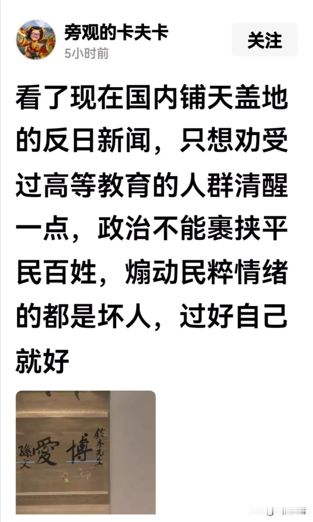 不知道您看了下面这篇微头条有感想,反正我看了是异常的愤怒。 针对日本首相高市早苗发表涉台挑衅言论之后,中国网民流露的不满情绪,这个叫“旁观的卡夫卡”的创作者写下了下面这篇不足60字的微头条: “看了现在国内铺天盖地的反日新闻,只想劝受过高等教育的人群清醒一点,政治不能裹挟平民百姓,煽动民粹情绪的都是坏人,过好自己就好。” 他的这篇微头条刚一发表便很快引起了国内网友的强烈不满。 有的质问道:“曾经的敌人现在又来挑衅,不明白为什么竟然还有自己人站出来说不要一直记住过去的仇恨?这种事不关己,高高挂起的态度,只会让日本人更加看不起我们。” 有的气愤地说:“我没有受过高等教育,但我知道现在的中日状况不是中国挑起来的,连美国都不敢明说的话,日本敢说,所以有些事我们必须做。” 有的感叹道:“有国才有家。每一个家庭都是一个小国,大国由千千万万个小家小国组成的,国家存在的价值和意义就是保护老百姓。” 有的呼吁道:“国家兴亡,匹夫有责!没有国,哪有家!” 反复读过“旁观的卡夫卡”这不足60字的短文后,我认为他的这篇微头条之所以会引起网友们的强烈不满,原因有如下几点: 1.缺乏是非观念。对挑起矛盾干涉中国内政的日本他不谴责,而对表达不满的同胞却颇有微词,称他们的行为是“反日”,称这些新闻为“反日新闻”。 2.骨子底里看不起普通老百姓,自以为高人一等,所以他说“只想劝受过高等教育的人群清醒一点”。 3.对自己的国家毫无感情,将宣传爱国、反对日本军国主义死灰复燃的行为称之为用“政治裹挟平民百姓”,并称这些爱国者是“煽动民粹情绪的坏人”。 4.不懂国与家的关系,不明白“天下兴亡,匹夫有责”的道理,认为老百姓“过好自己就好”。 从网名看,这个人应该是个知识分子,否则,他不会在网名中用上“卡夫卡”这个名字。 我建议平台和有关部门要好好查一查这个人。看看他究竟是一时糊涂,还是一个铁杆的“精日”分子。