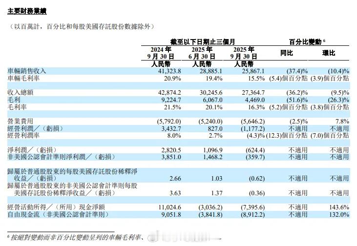 理想汽车营收下滑36%导致这一结果的主要原因有二:一是理想MEGA召回预估成本计入三季度。二是产量下降推高单位制造成本。 若剔除MEGA召回成本影响,车辆毛利率可恢复至19.8%,整体毛利率为20.4%比毛利率下滑更严重的是现金流的恶化。财报显示,理想汽车三季度经营活动所用现金净额为-74亿元,自由现金流为-89亿元。这一数据与去年同期91亿元的正值形成鲜明对比,反映公司主营业务“失血”严重