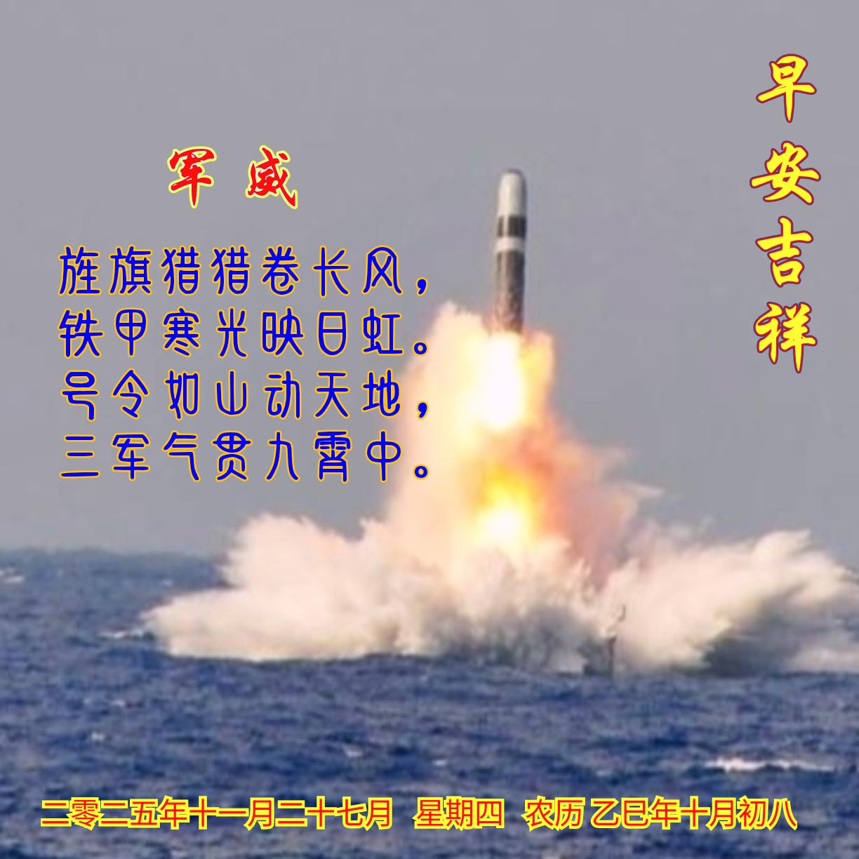《军魂》 金甲寒光耀九天, 旌旗漫卷镇边关。 忠心铸就英雄胆, 永固华夏好江山。