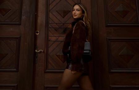 一袭裸色修身裙勾勒苗条曲线,米白开衫轻抚肩头添几分柔婉,粉色凉鞋与白色...