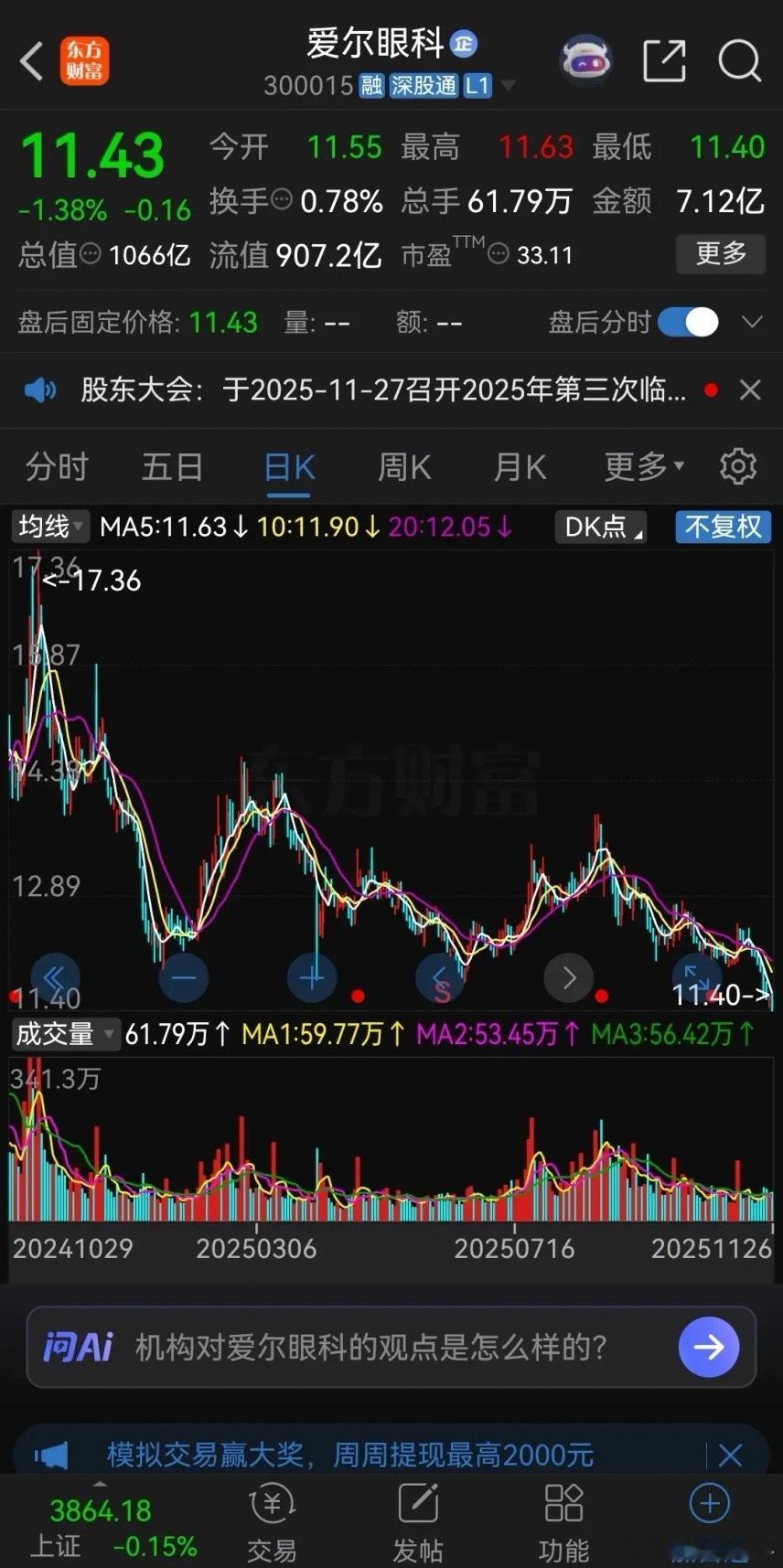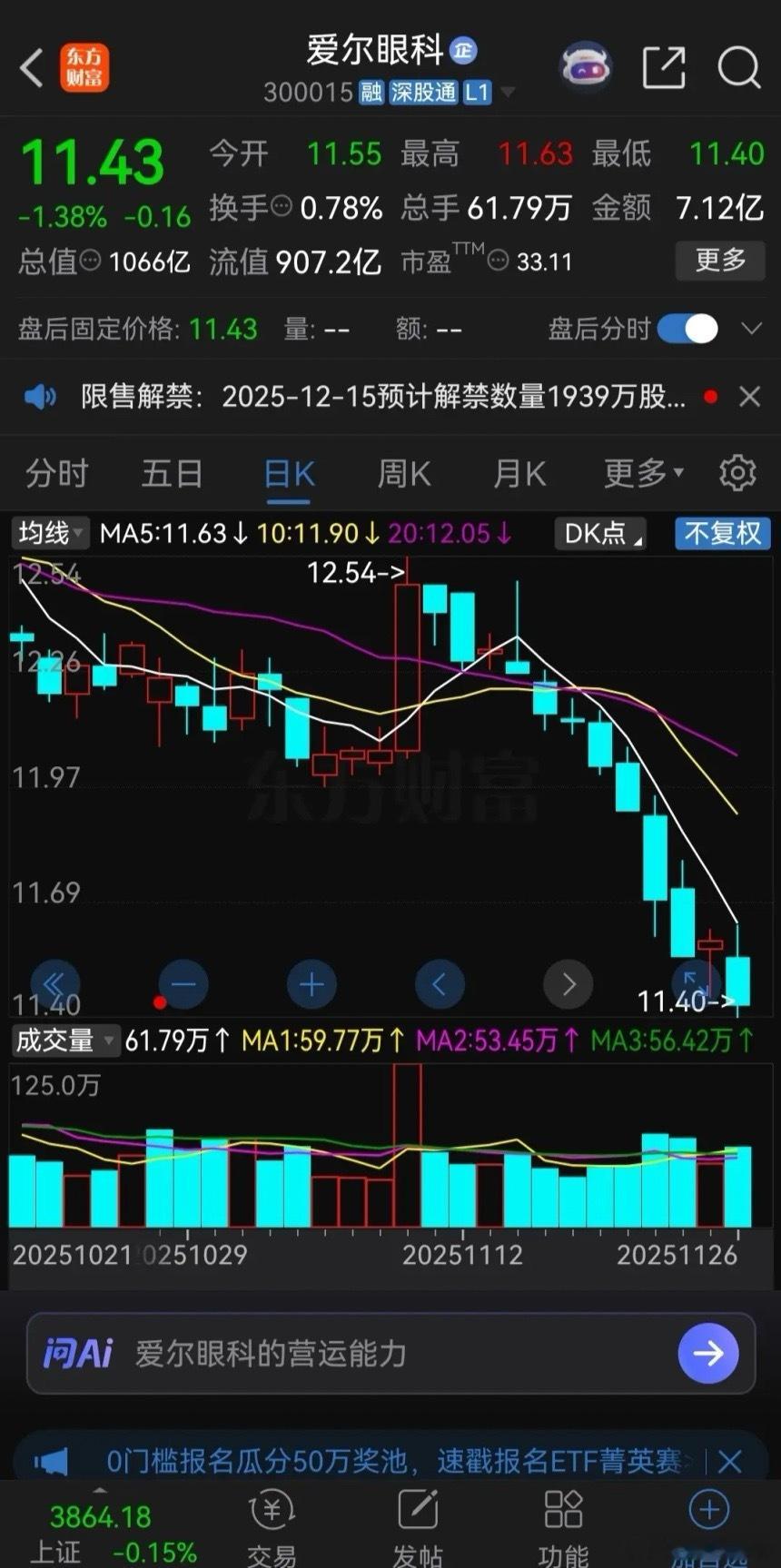 爱尔眼科这走势让股民们泪奔!最近一路崩盘式下跌,12个交易日收出10根阴线,今天最低跌到了11.40元,创出了今年以来的新低。这个价格比四月份关税贸易战时的最低点还要低,相当于跌到3000点以下了,至少落后大盘上千点。今年以来进场的股民全部被套,可以说这轮牛市和它毫无关系。公司每年几百亿的营收,几十亿的净利润,要说业绩也不差。而且从高位下跌了四年,区间跌幅高达近80%,按理说不应该这么惨烈下跌啊,难道公司有股民不知道的雷吗?