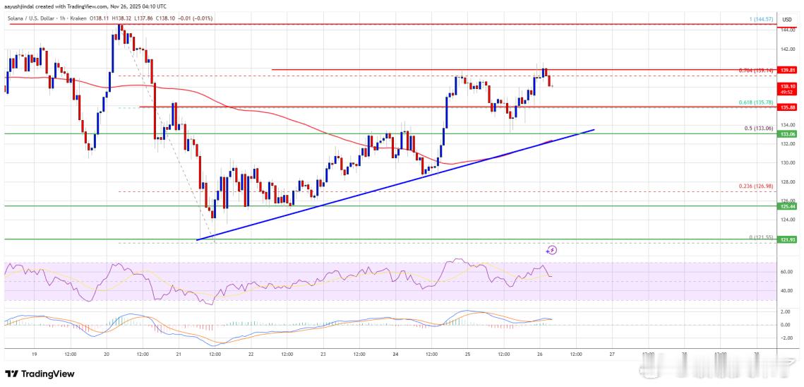 Solana 价格反弹回到 135 美元上方,短期盘整在 140 美元 附近遇阻。支撑位在 133 美元 上升趋势线,若突破 140–145 美元 阻力,将打开上涨空间,下一目标 155–162 美元。下方支撑关键在 128–122 美元,跌破可能触发回调。区块链山寨币