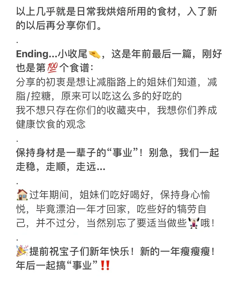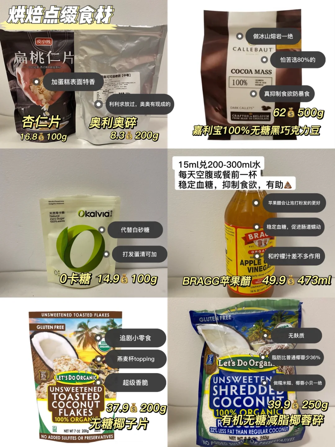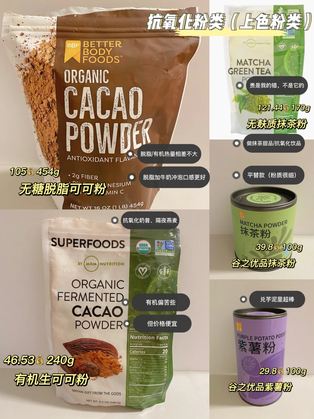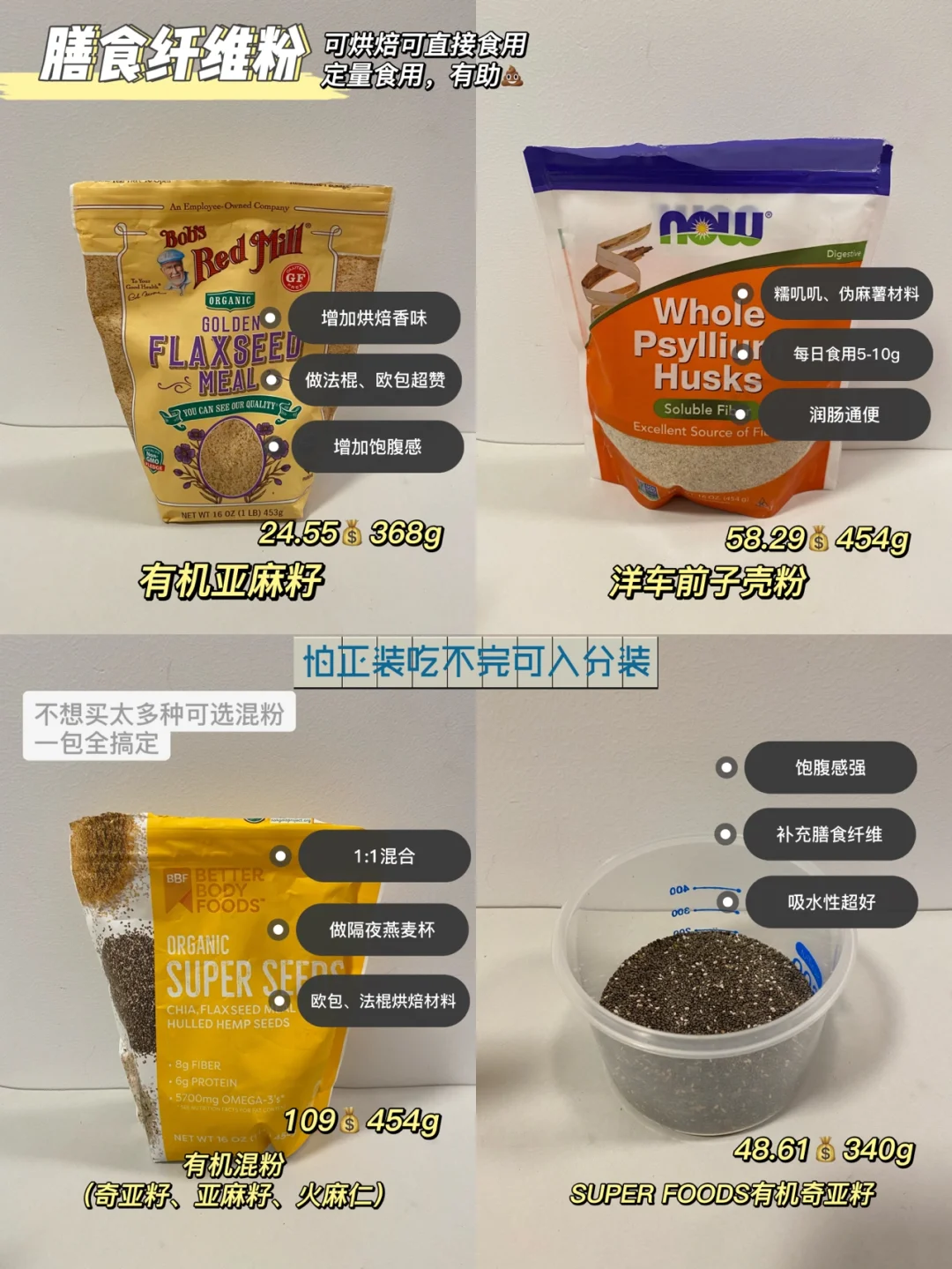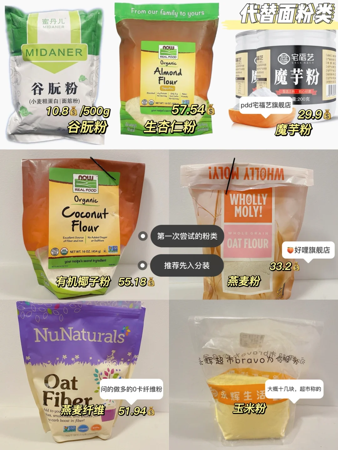 🙇‍♀️被问了N次的粉类合集终于整理好了‼️内容较多,宝子们耐心食用‼️都是我的多年自用款‼️ 🙋‍♂️秉持不浪费,不花冤枉💰的原则,很多粉都有多种用途,日常可吃,烘焙也可用‼️姐妹们按需求入‼️ 💕第一次尝试,推荐入分装~ . 【代替面粉的粉类】 0卡燕麦纤维、魔芋粉、椰子粉、杏仁粉(扁桃仁粉)、谷朊粉、燕麦粉、玉米粉 . 【燕麦类】 有机的、高纤维的、常规的 (比起大颗粒燕麦,更推荐麸皮) . 【花生酱类】 花生酱(颗粒or顺滑)、花生粉(低脂or脱脂) . 【烘焙抗氧化(上色)粉类】: 抗氧化:有机生可可粉、无糖脱脂可可粉 抹茶粉(平价的、有机的) 其他:黑芝麻粉、紫薯粉、红曲粉 . 【膳食纤维类】(润肠通便): 洋车前子壳粉、亚麻籽粉、奇亚籽、火麻仁粉 . 【其余烘焙食材】 脱脂椰蓉碎、无糖椰子片、奥利奥碎、杏仁片、蔓越莓干、黑巧克力豆、黑巧等 . PS:以上是我长期吃的用的,经验谈不上,若有疑问👇可一起探讨 . 🎉最后,祝我的仙女们新年快乐,过年期间就不更啦,毕竟是要好好干饭的人‼️宝子们吃好喝好,咱们年后再减~