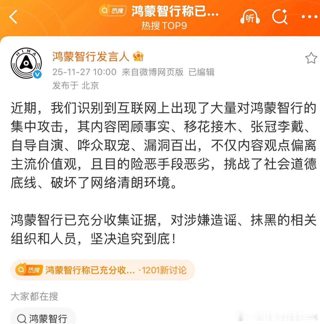鸿蒙智行称已充分收集证据对涉嫌造谣、抹黑的相关组织和人员,坚决追究到底希望行业赶紧回归正常的舆论环境中来吧