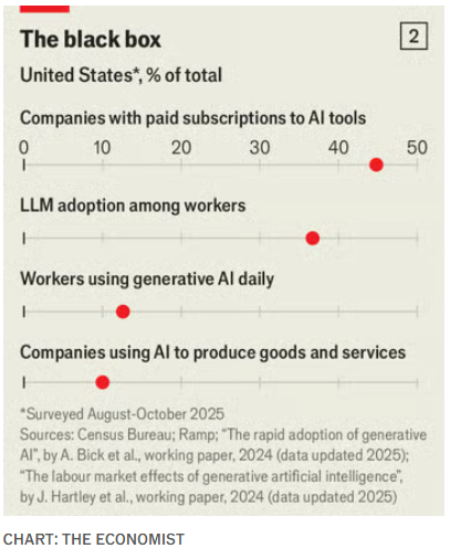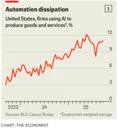 投资者预期AI使用将迅猛增加,但最新官方和民间调查都显示企业采用率趋于停滞美股美股海外新鲜事 本文刊发于经济学人网站。11月20日,美国统计学者公布了一项调查结果,数据中隐藏着一项可能影响数万亿美元支出的趋势。美国人口普查局的研究人员,询问企业在过去两周是否在“生产商品和服务”中使用了人工智能。我们估算,按就业人数加权,美国人在工作中使用人工智能的比例最近下降了一个百分点,目前为11%。在员工超过250人的大型企业中,AI的采用率大幅下降。为海外华人提供有价值的信息与分析,更多内容和全文可在蓝天、电报、x查找causmoney,或直接谷歌搜索生成式AI浪潮已经持续三年,然而对这项技术的需求看起来却出乎意料地疲软。人工智能普及得快还是慢,将产生深远影响。要想让全球从AI中获得生产率提升,普通企业必须把这项技术纳入日常运营中。这也是判断当下是否存在“AI泡沫”的关键问题。从现在到2030年,大型科技公司将在AI服务基础设施上投入5万亿美元。根据摩根大通的估算,要让这些投资物有所值,AI的年收入需达到6500亿美元,而目前这一数字仅为约500亿美元。个人在日常生活中购买AI服务的支出可能只是其中的很小一部分,企业必须填补其余部分。人口普查局只是众多数据来源之一,其他研究者也在汇总自己的AI采用率估算;多数研究发现AI采用率高于10%。经济学家们对此产生了争议。一些人认为,人口普查局的调查过于严苛,人们如何理解“在生产商品和服务中使用AI”这一问题并不明确。如果改为询问员工本人是否在工作中使用AI,可能会比问高管更容易得到积极回应。人口普查局的支持者则反驳说,只有政府才拥有足够庞大的网络,能抽样出真正具有代表性的美国企业群体,而不仅是那些较为创新的行业,如编程公司。即使是非官方的数据,也显示企业对AI的采用在停滞。斯坦福大学的乔恩·哈特利及其同事发现,今年9月,美国人在工作中使用生成式AI的比例为37%,比6月的46%有所下降。圣路易斯联邦储备银行的亚历克斯·比克及其同事的追踪数据显示,2024年8月,有12.1%的适龄工作人口每天在工作中使用生成式AI,一年后上升到12.6%。金融科技公司Ramp发现,2025年初,美国企业中AI使用率飙升至40%,随后趋于平稳。AI的采用确实显示出增长放缓的迹象。一个可能的解释是经济不确定性,包括贸易战、移民减少以及利率前景不明等因素,使得企业在投资前持观望态度。此外,历史经验表明,新技术的普及常常是断断续续的。比如,美国家庭电脑的使用在20世纪80年代末曾经放缓,但那只是一个短暂的插曲,随后在90年代迎来全面普及。当然,也可能存在更不乐观的原因。导致AI的普及停滞。其中之一是企业内部的权力结构。几乎所有高管都在赞美AI。在最近的财报电话会议中,近三分之二的标普500公司高管都提到AI。然而,真正负责实施AI的人可能并不那么积极,或许是因为担心AI会让他们失业。软件公司Dayforce的一项调查发现,87%的高管在工作中使用AI,而管理层中只有57%,普通员工更只有27%。也许中层管理者只是为了满足上级的要求设立AI项目,但后来悄悄把项目取消。人们对AI实际效用看法的变化,可能也是导致AI采用放缓的原因之一。越来越多的证据显示,目前这一代AI模型还不足以彻底改变大多数企业的生产力。现有用户如果觉得AI的投入产出不理想,潜在用户可能就会迟迟不愿采用。以下三方面的证据,可能会让企业在是否采纳AI方面犹豫不决。首先,是来自资本市场的信号。高盛编制了一个指数,追踪那些“因AI带来生产力提升而对基础盈利预期变化最大”的公司。这个指数包括了福特、报税公司H&R Block以及新闻集团等积极推进AI计划的企业。长期以来,这些公司的股价走势与整体市场一致。但最近,这一指数开始落后。至少到目前为止,投资者还没看到AI采用带来盈利能力或增长的明显改善。其次,是调查数据。德勤与香港大学人工智能、管理与组织中心联合对高管进行的一项调查显示,45%的高管表示AI计划带来的回报低于预期,只有10%的高管认为超出了预期。咨询公司麦肯锡的一项最新研究则指出,对于大多数企业而言,AI的使用还未能显著提升整体利润。第三,是经济学研究。至少在短期内,引入AI可能以出人意料的方式降低生产率。企业为了重构IT系统和工作流程,可能在一段时间内导致效率下降,随后才会大幅提升。斯坦福大学的埃里克·布林约尔松将这种现象称为“生产率J曲线”。也有人认为AI还存在另一种独有的问题。上海科技大学的论文中提到“生成式AI的平庸陷阱”。AI技术可以帮助人们产出“够用”的内容,这对能力较弱的员工有帮助,但研究发现,这反而可能降低高效员工的生产率,因为他们会因此变得不那么努力。企业终将学会更高效地利用AI,而AI模型本身也将持续改进。如果越来越多的证据,能证明这项技术在提高工作效率方面确实具有变革性,更多企业就会意识到AI是不可或缺的。即使真有这一天,现阶段的停滞也表明,从AI中获得经济回报的过程将比人们想象中更慢、更不均衡、成本更高。在AI采用率快速提升之前,企业要实现足以支撑5万亿美元投资的收入,仍遥不可及。