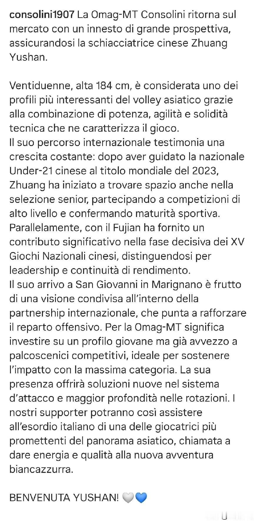 庄宇珊成功签约意甲中国女排 国际排坛专业排球经纪公司LZ Sport官宣中国女排主攻手庄宇珊加盟意大利康索里尼俱乐部。这是中国女排又一位留洋的运动员,加油!