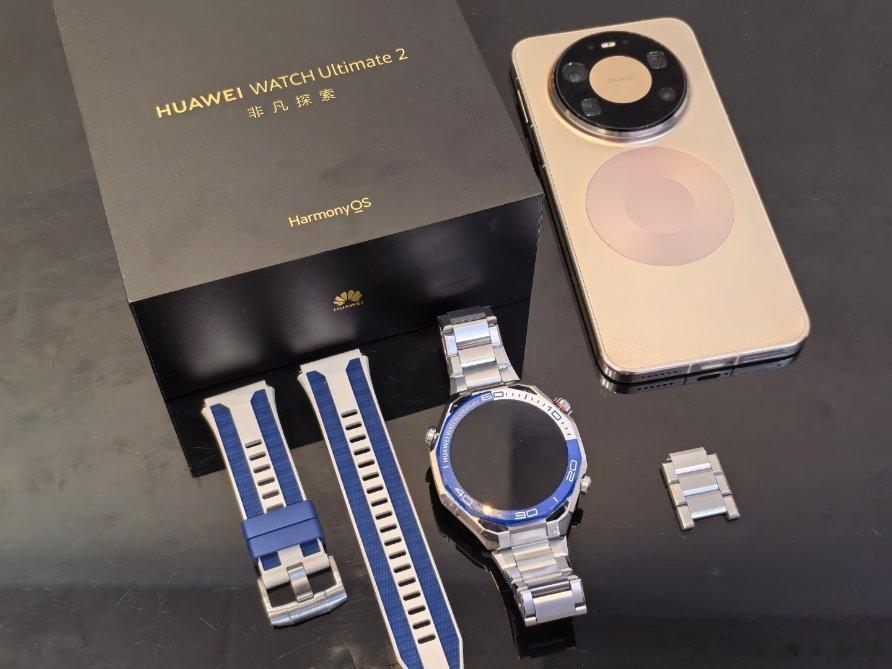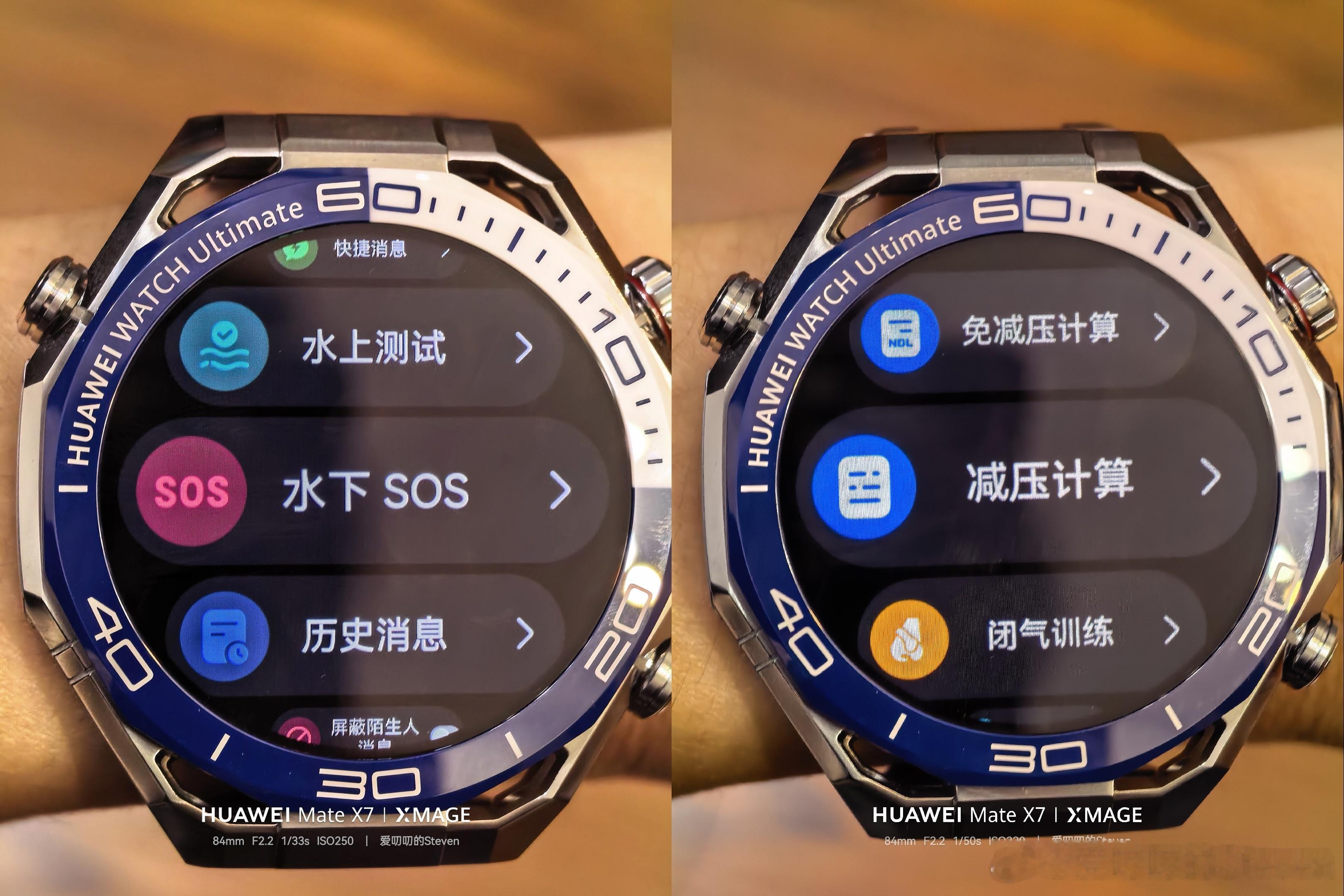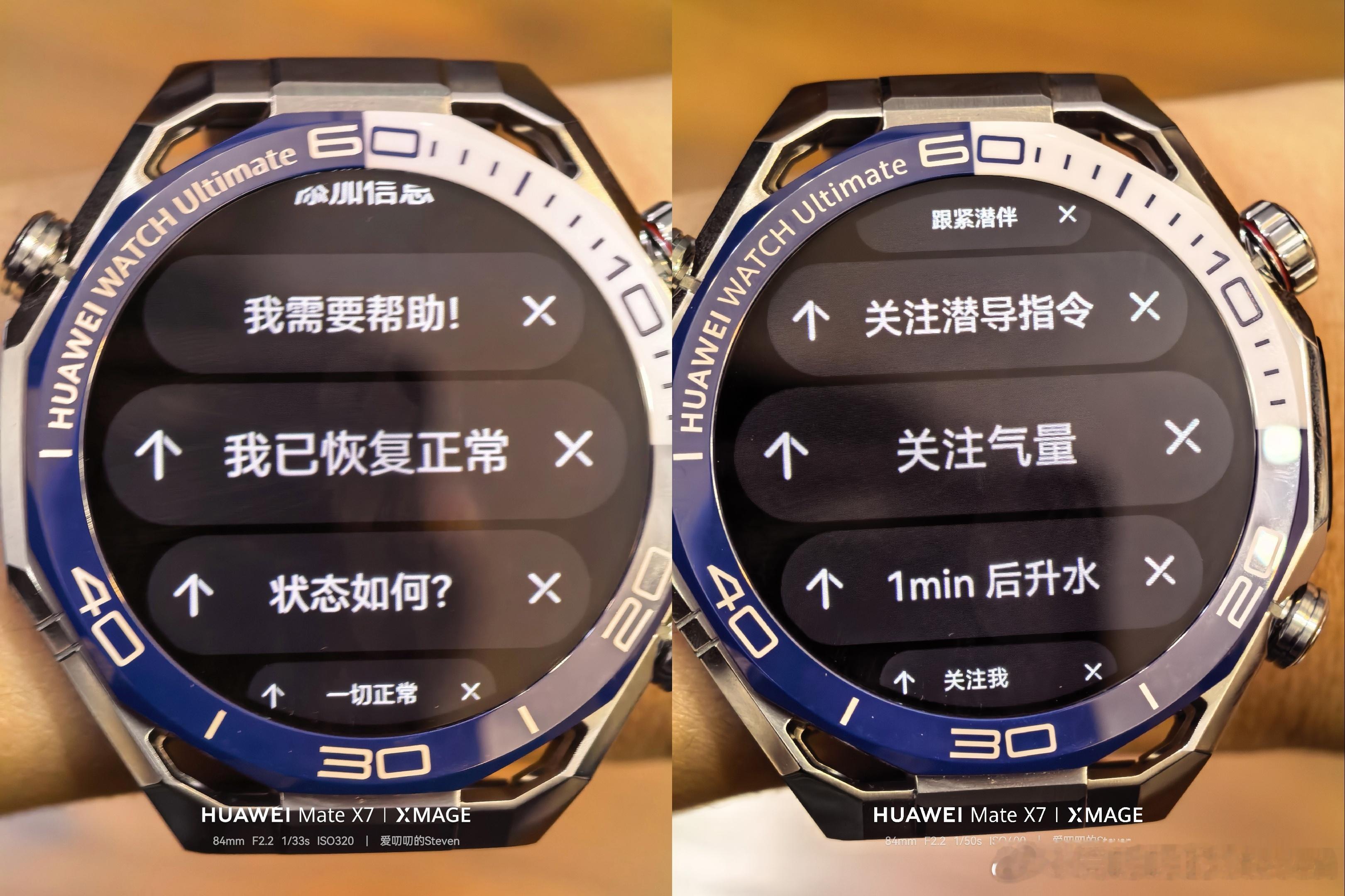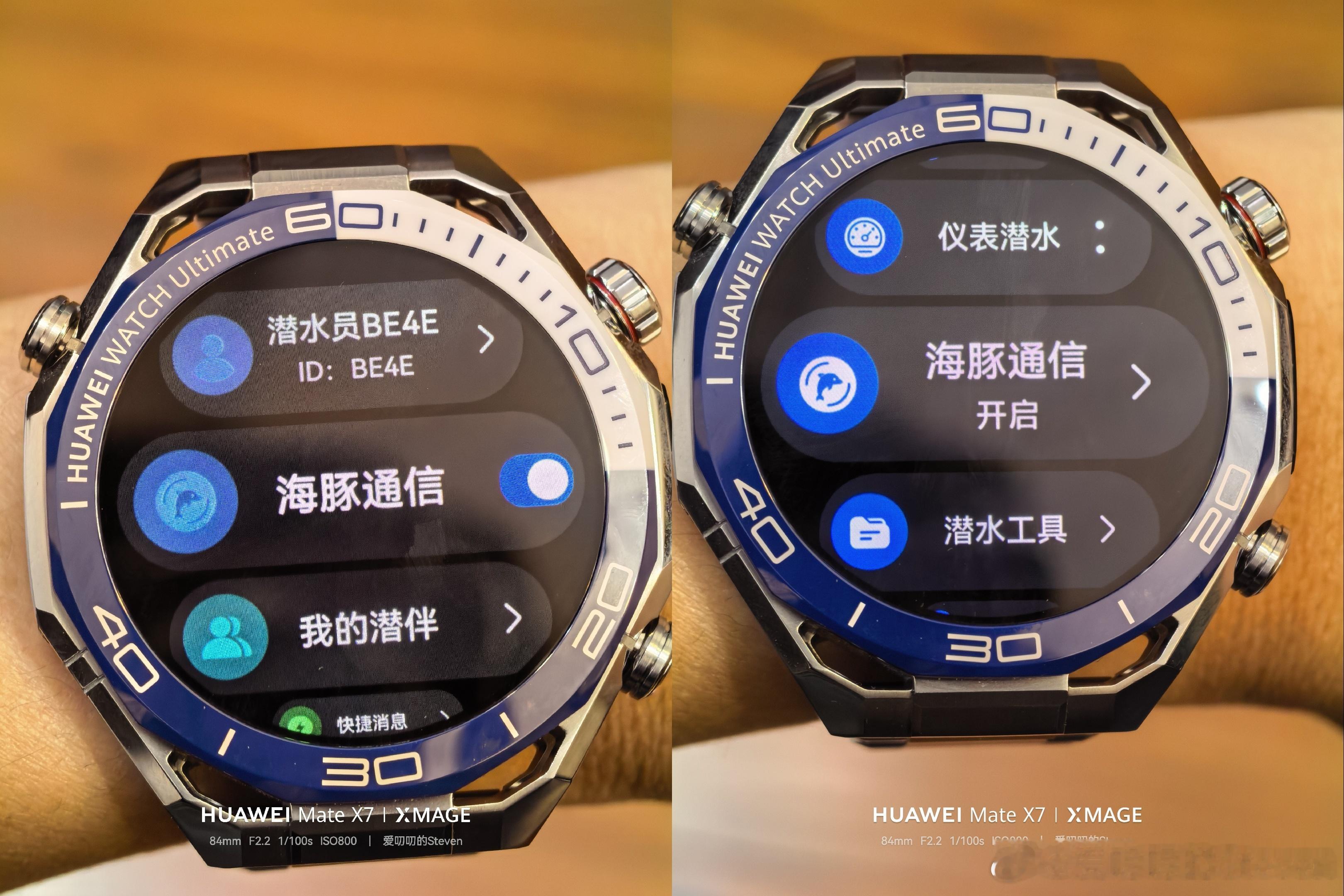 更喜欢表,所以还是先试了下,真·潜水水表 非凡探索2。这次全新推出的一个黑科技「海豚通信」。最大支持150米深潜通信,可以进行正常的团队指挥,常用的潜水战术,紧急情况下也可以SOS,功能非常专业,非常强大。当然了除此之外,也是一款颜值非常不错的运动健康手表,蓝白表圈我个人觉得还是非常显年轻的。出厂是氟橡胶表带偏运动休闲,还配了一个钛金属表带(我更喜欢金属的所以直接换上了)。这一代也支持手势控制,所以也支持和鸿蒙智行的车进行手势开门手势控车。华为watch可靠的mate