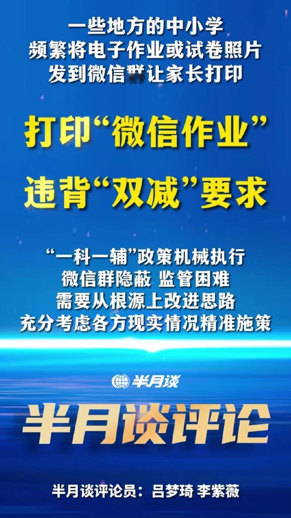这事情也别怪小学老师,上面有考核,一整个县里比成绩,小学老师也得要成绩。但是,又不允许统一订练习册、资料,因为怀疑老师会和书商有利益来往,即使指定某种练习册,让家长自由购买,也会被家长投诉,真是没有办法只好亲自整理一些资料,让家长打印出来给孩子做。而且,已经有地区不允许老师在家长群里发试题了,老师只好让家委会的在群里发题。大家好好想一想,老师图什么?就图一个学生考个好成绩,自己不被通报批评,家长也高兴。 就实话来说,很多家长不敢骂校长,也不敢骂教育局,就只敢骂没有地位的老师,老师承受了不该承受的指责。半月谈的评论说的很对,“需要从根本上改进思路,充分考虑各方的现实情况,精准施策。”