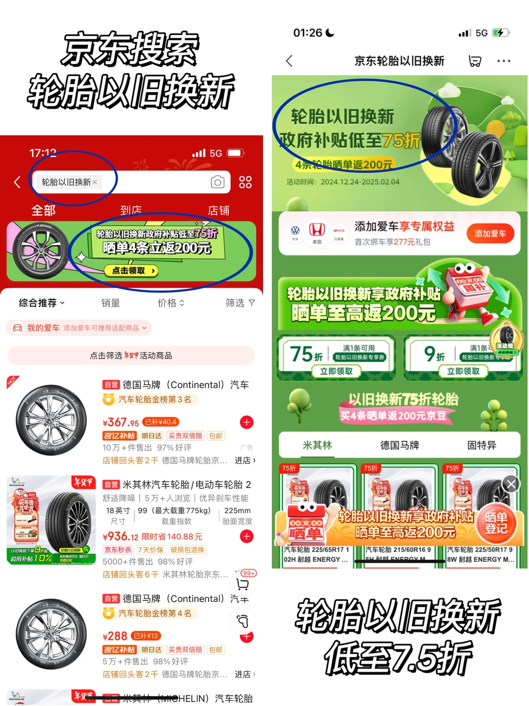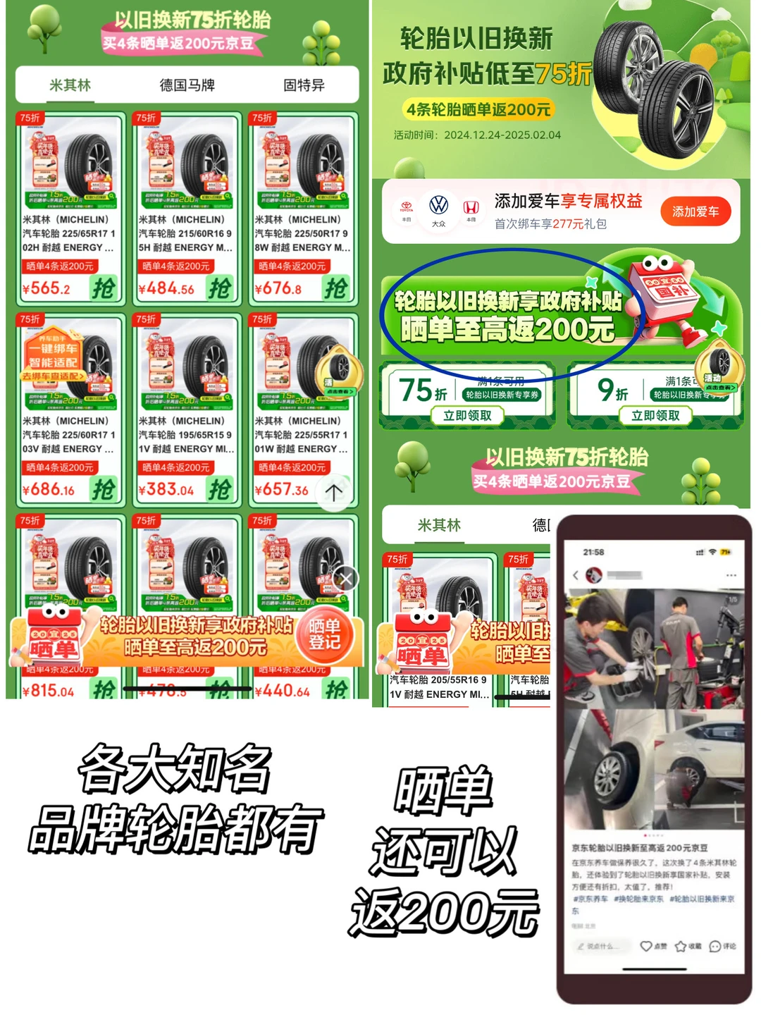 2024年12月4日至2025年2月4日,京东搜“轮胎以旧换新”买轮胎享政府补贴7.5折起。部分爆款轮胎购买后在晒单,带话题轮胎以旧换新来京东,可以至高返200元(具体规则可以见话题内页)。
