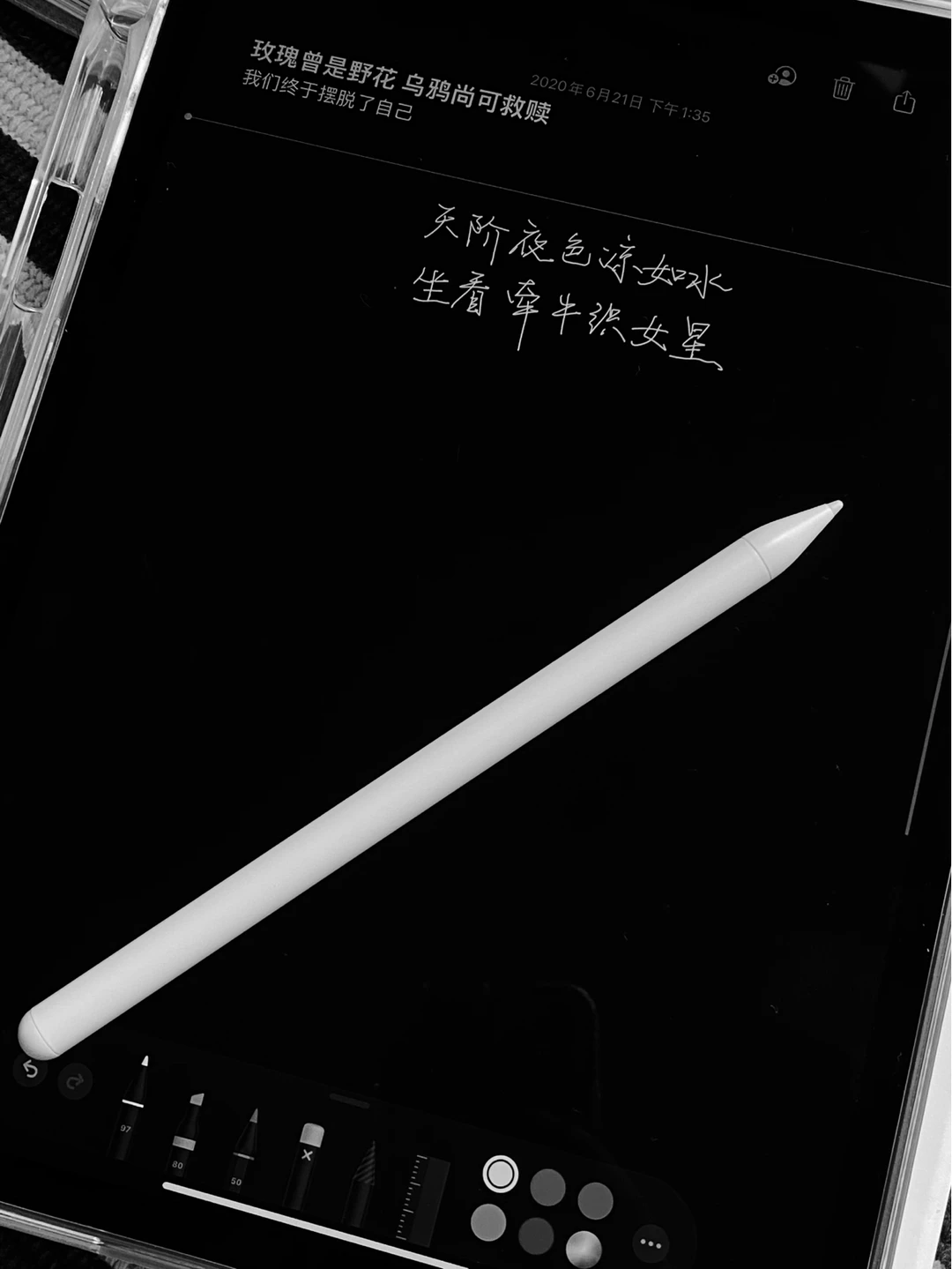 关于笔,因为我买过pencil一代最早一批,质量非常差,心有余悸。另外因为不是画画,也就是修图时比比划划,偶尔记录一下文字,所以最后选了平替笔二代,磁吸快充防误触倾斜压感。测试了一下,还不错,写字✍很顺滑,碰一下笔帽自动激活,也可以吸附在ipad一侧。