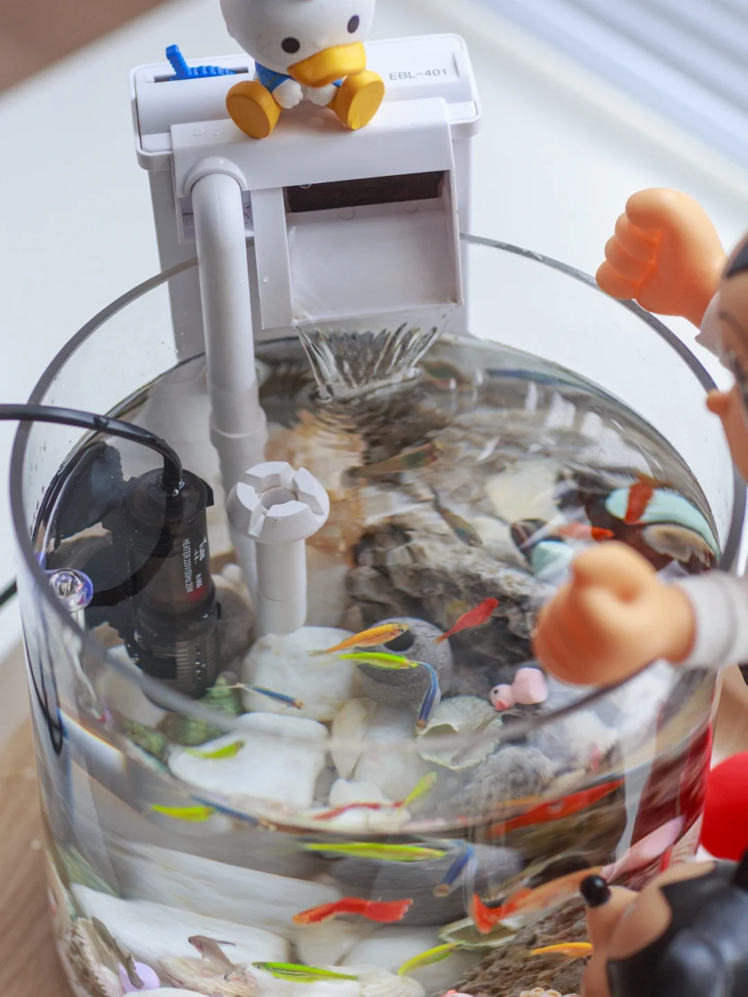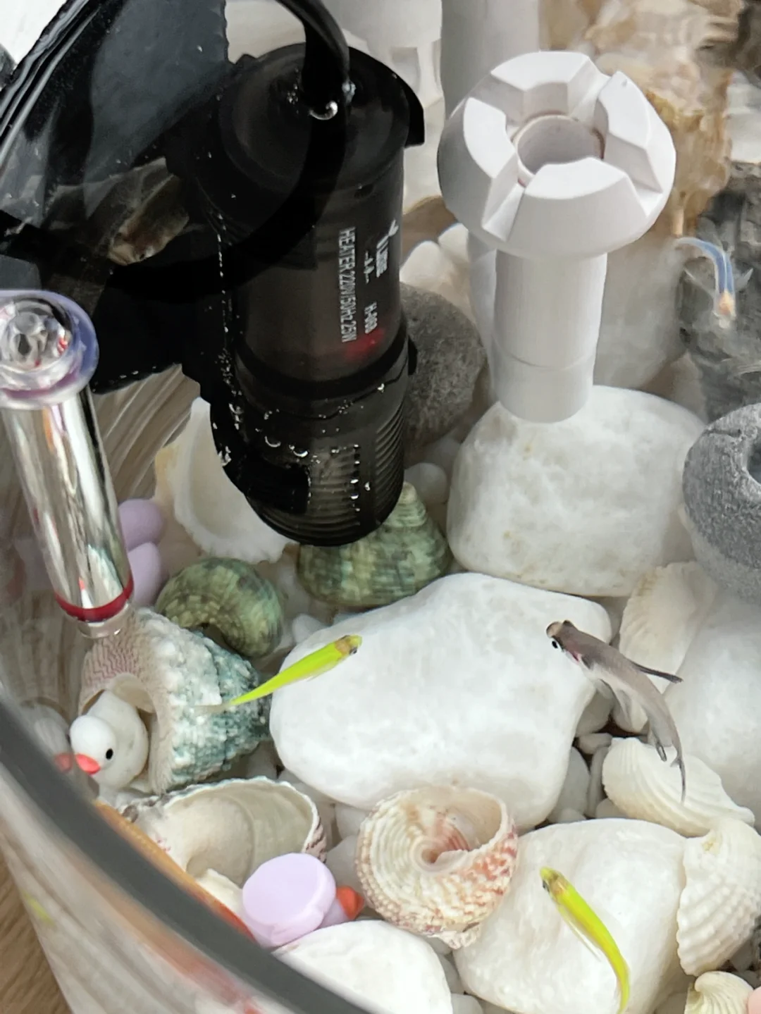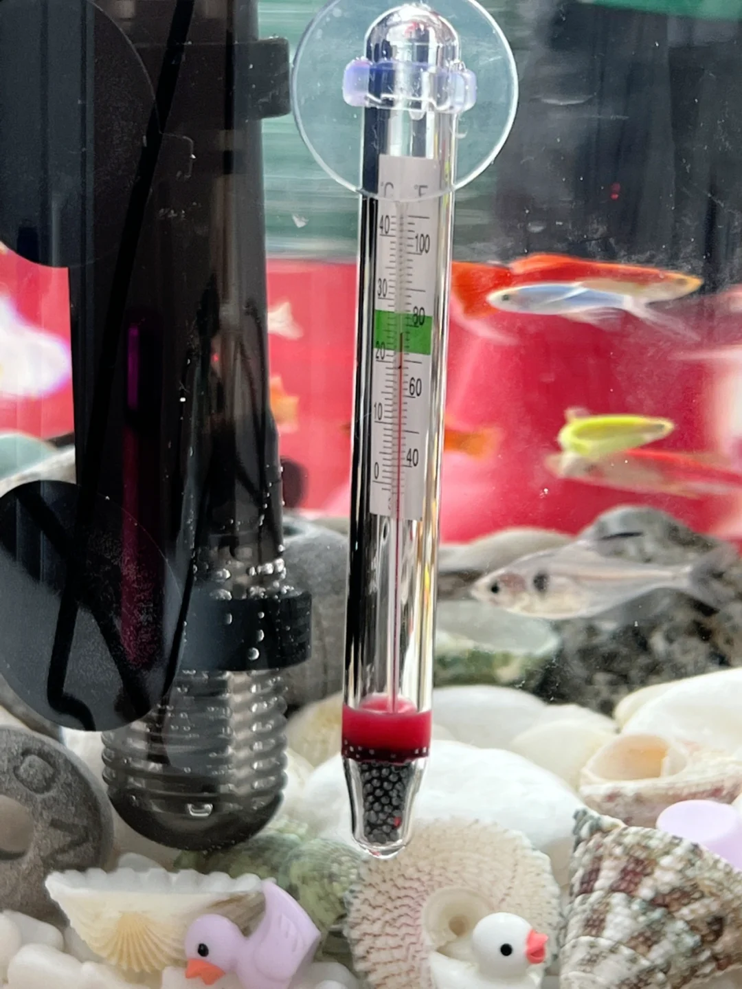 冬至过后,气温越来越低。给客厅飘窗的鱼缸添加了加热棒,可以让水温恒温26°,让鱼儿们过个暖冬🥰 顺便也更换了新的水循环过滤器,比之前的更静音🔕,真的是一点声音都没有了。 - 又给鱼缸添加了好多条小鱼🐟~孔雀、斑马长鳍、米奇鱼。已经是很热闹的玻璃圆形鱼缸。 - 底砂也重新换成了小白石头。上次用的白细沙非常细了,搭理非常不方便。 - 图6图7是恒温加热器(黑色那个),25瓦就够用啦。玻璃壁贴了个鱼缸温度计🌡,测量水温。不知道是不是心理作用,感觉恒温后,小鱼们游的更活泼。 -
