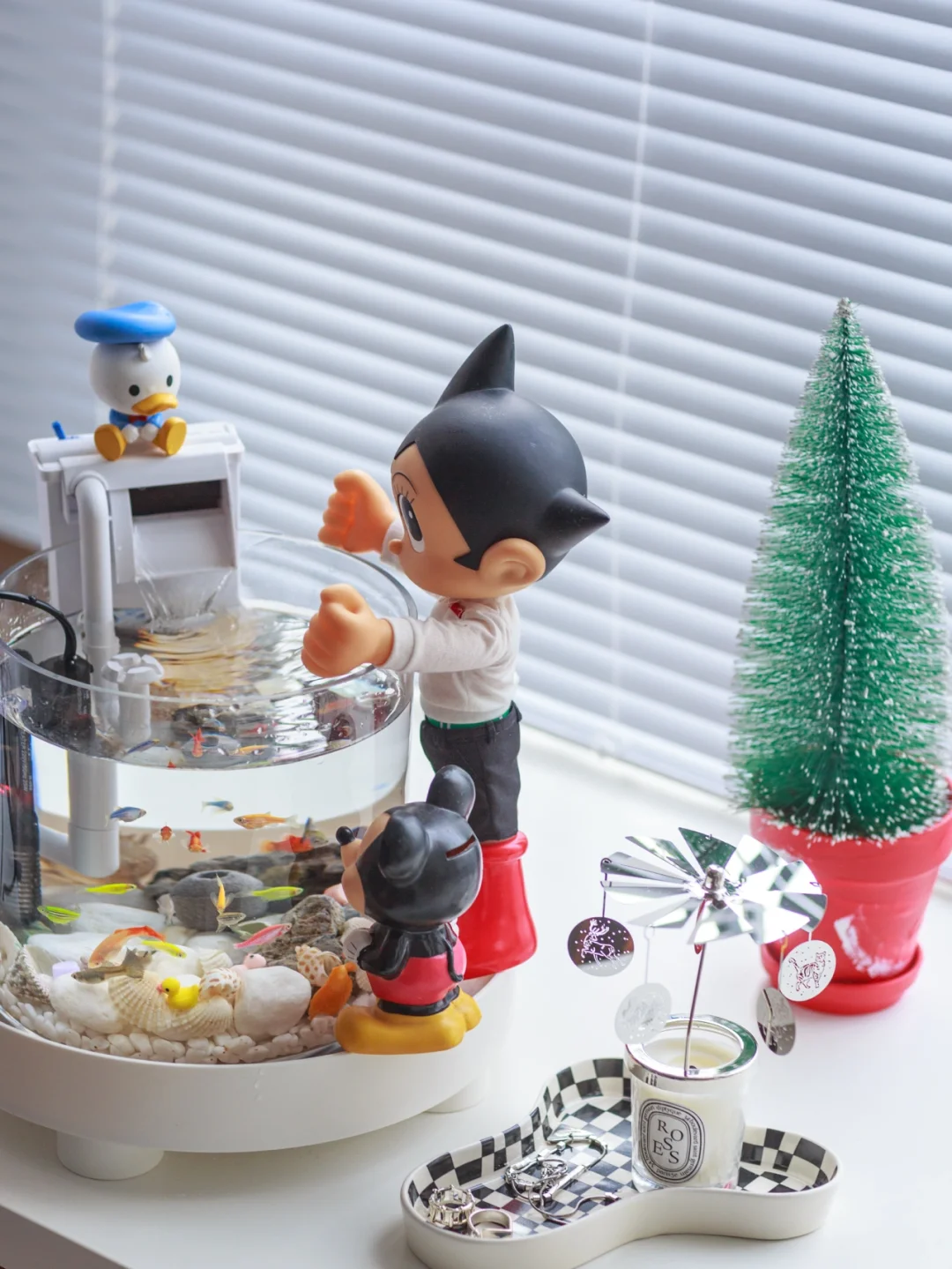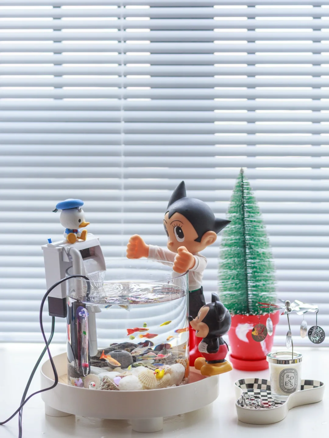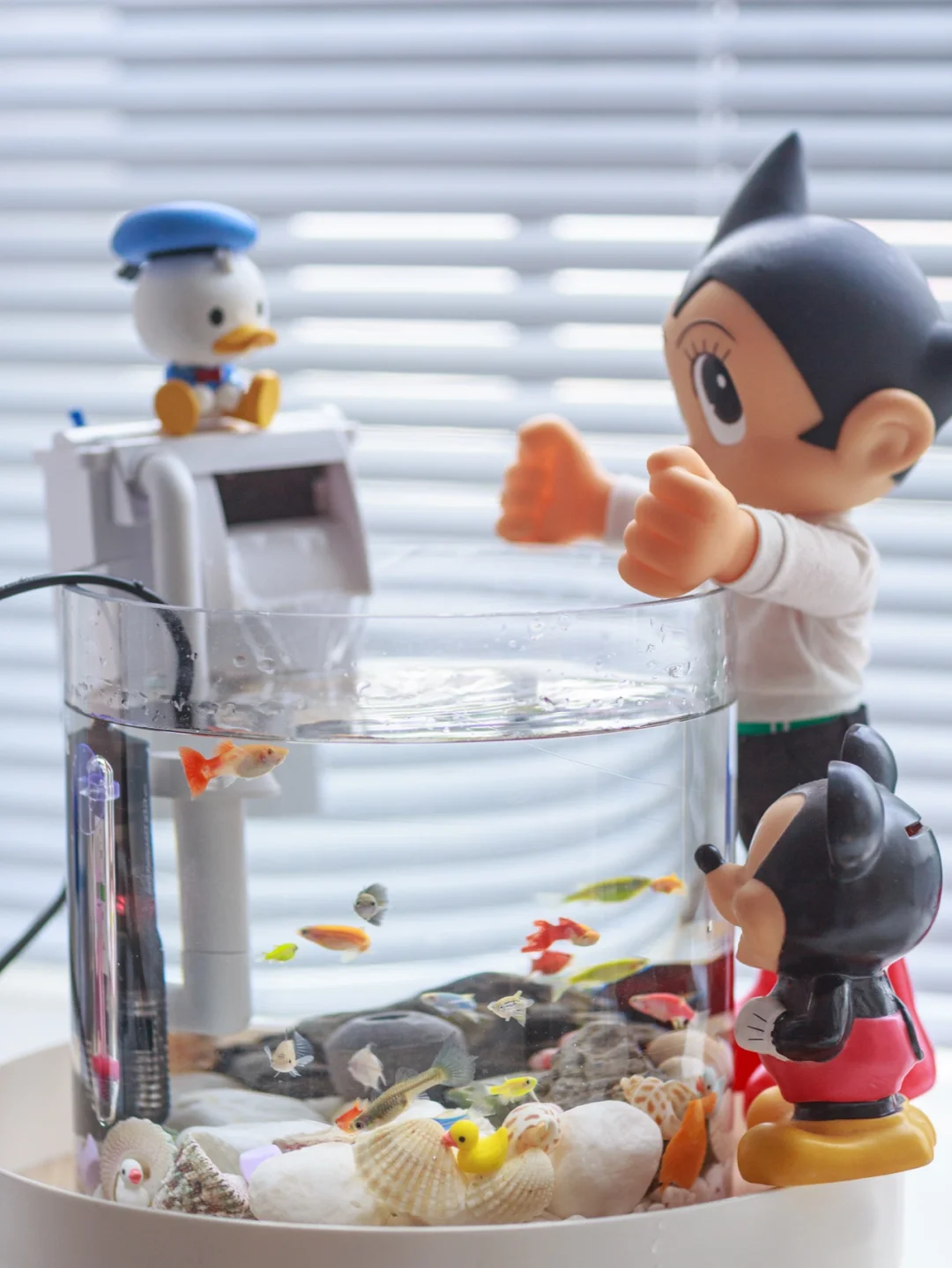 冬至过后,气温越来越低。给客厅飘窗的鱼缸添加了加热棒,可以让水温恒温26°,让鱼儿们过个暖冬🥰 顺便也更换了新的水循环过滤器,比之前的更静音🔕,真的是一点声音都没有了。 - 又给鱼缸添加了好多条小鱼🐟~孔雀、斑马长鳍、米奇鱼。已经是很热闹的玻璃圆形鱼缸。 - 底砂也重新换成了小白石头。上次用的白细沙非常细了,搭理非常不方便。 - 图6图7是恒温加热器(黑色那个),25瓦就够用啦。玻璃壁贴了个鱼缸温度计🌡,测量水温。不知道是不是心理作用,感觉恒温后,小鱼们游的更活泼。 -