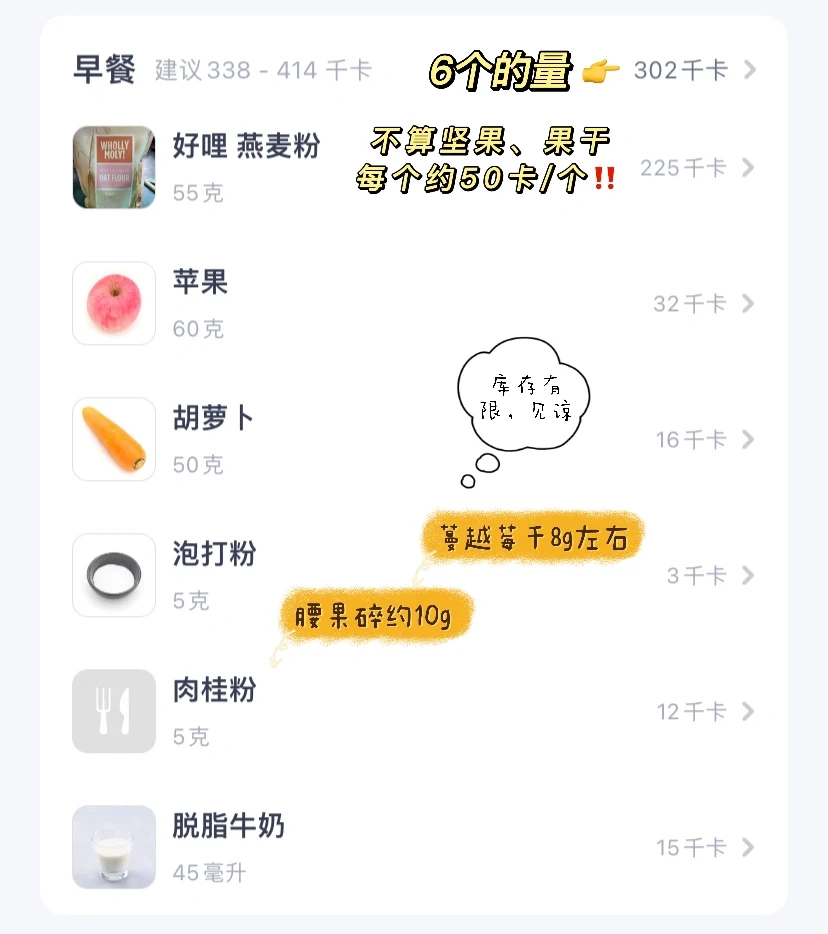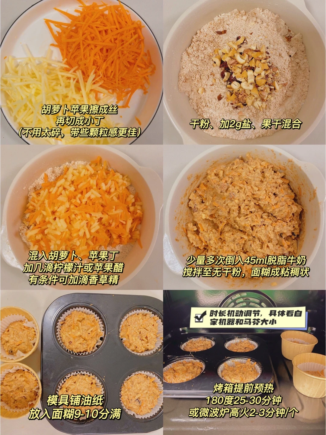 👩‍🍳苹果肉桂胡萝卜麦芬,这个组合一定要试‼️不是黑暗料理,真的惊艳‼️在咖啡店吃过一次,至今难忘‼️家庭复刻减脂改良版,安排上‼️ 💕50卡/个|无糖无油无面粉,纯素版 🌈老人小孩都能吃‼️减脂、健身、麦芬蛋糕、甜品脑袋冲‼️ . 🍃食材(302卡-6个👉附热量表): 燕麦粉55g(🉑️换全麦粉) 苹果60g|胡萝卜50g(丝状) 泡打粉5g|肉桂粉5g|盐2g 脱脂牛奶45-50ml 坚果碎、果干碎适量 🌈鸡蛋可加可不加,若加,奶的量适量减少;苹果、胡萝卜先切丝再改丁,不用太碎,保持些颗粒感更好; . 📖简单步骤一看就会,直接翻图6⃣️ 🌈热吃外脆内软,冷吃多了些嚼劲,冷热口感皆丰富,坚果的颗粒配上苹果和果干自带的甜味,整体口感微甜的刚好 . 食材简单,美味不简单‼️ 减脂低卡小蛋糕,配咖啡、牛奶超棒‼️做早餐、下午茶都超nice‼️ ㊗️仙女们越吃越瘦‼️