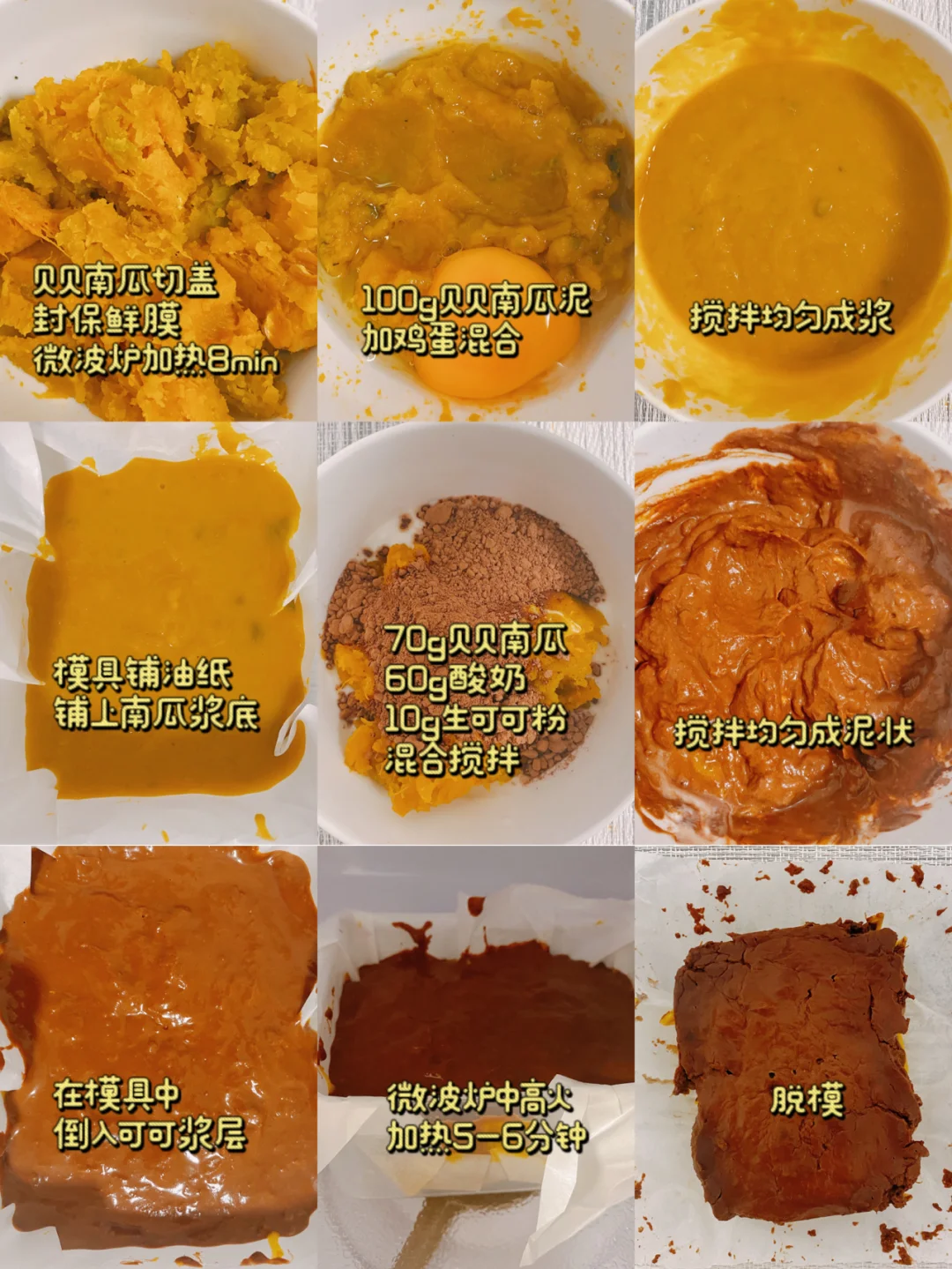 【题记】可可控看过来!双层风味布朗尼了解下~每口都是别样的惊喜❗️低卡饱腹无负担,好吃好做还不会胖❗️冲了冲了呀‼️ ✨✨✨ 🍃食材: 鸡蛋1个 生可可粉10g(生可可粉会有些苦,但是有很好的抗氧化作用,同时对南瓜和酸奶起到一个中和作用,若是喜甜口的人,可可粉可少放些,3-5g上个色即可) 脱脂酸奶60g(无糖酸奶、浓稠酸奶均可,脱脂热量更低) 贝贝南瓜170g(这是蒸熟后去皮去籽的重量) ✨✨✨ 详细🔎制作步骤见图5⃣️ 🌈:之前笔记有教过,贝贝南瓜快递成熟的方式,还记得嘛!建议选用贝贝南瓜哦,普通南瓜水分较多不易成型 ✨✨✨ 双色南瓜布朗尼就这样完成了,是不是很简单,冷藏后风味更佳哦‼️饱腹感强的同时还有助于消化哟[派对R] 做早餐和下午茶就很nice[赞R]保持身材是女孩子一生的事业,好好吃饭才能更好的减脂‼️姐妹们,减脂也别亏待自己的嘴和胃哟[萌萌哒R]