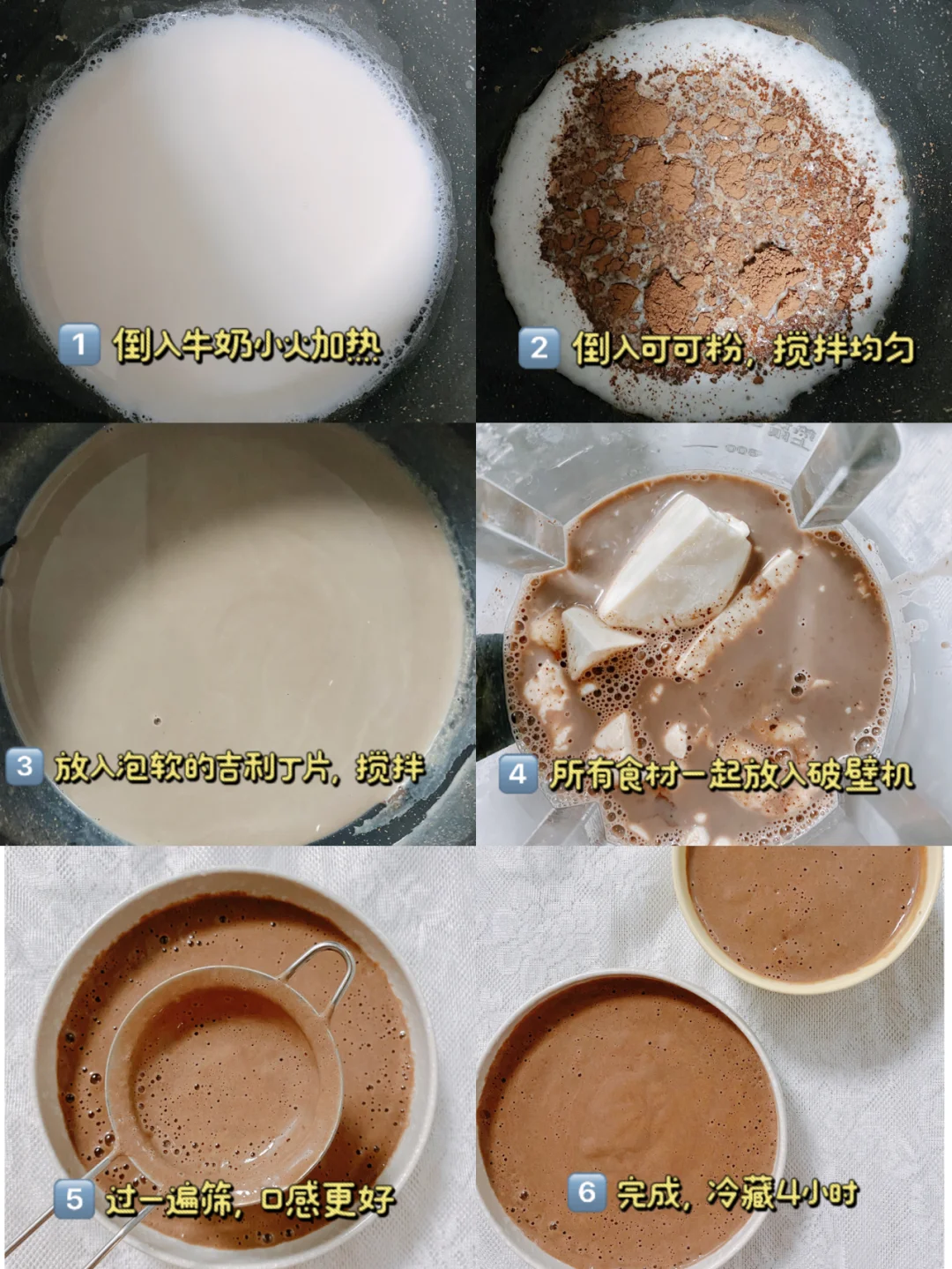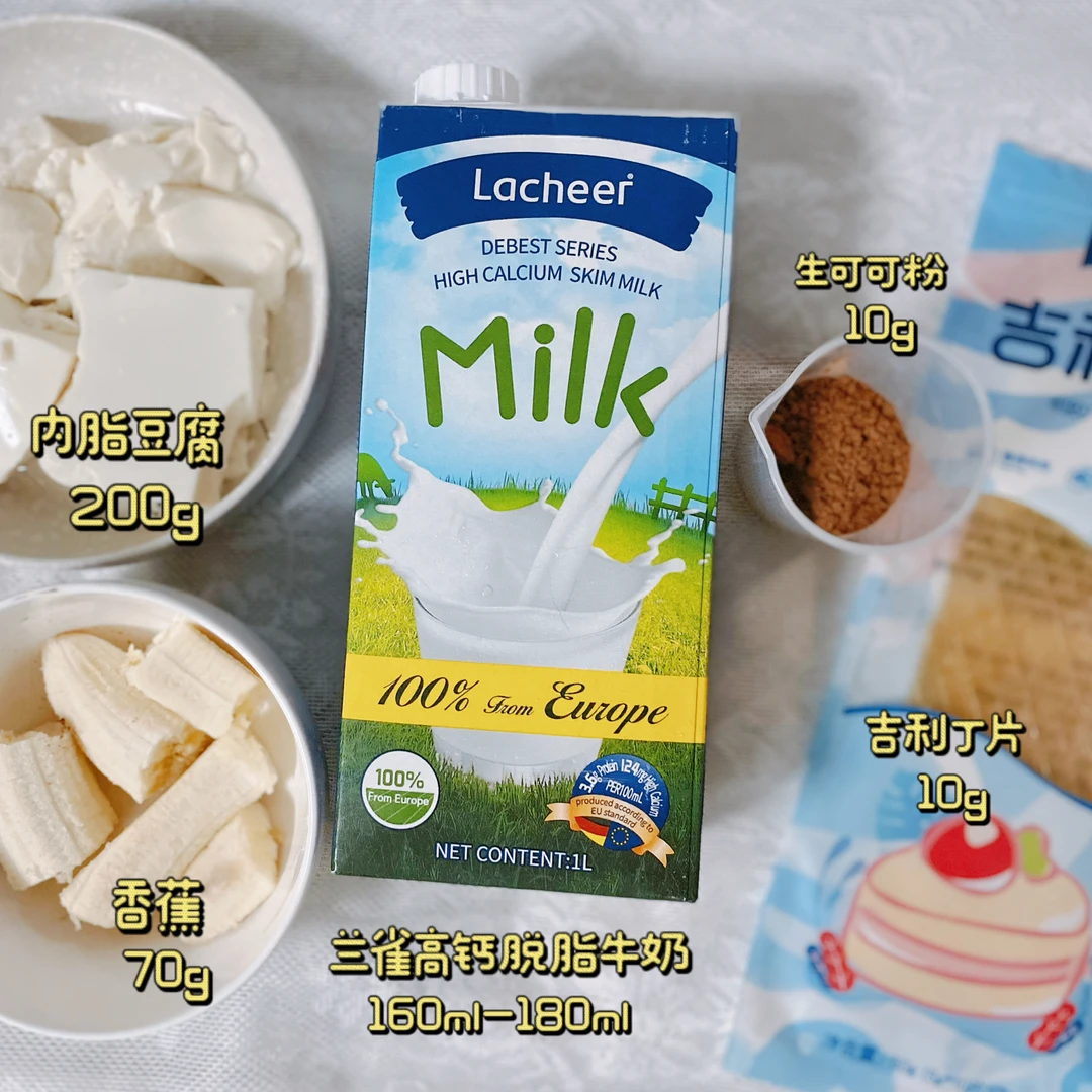内脂豆腐200g、脱脂牛奶160-180g、生可可粉10g、香蕉70g(一小根)、吉利丁片10g