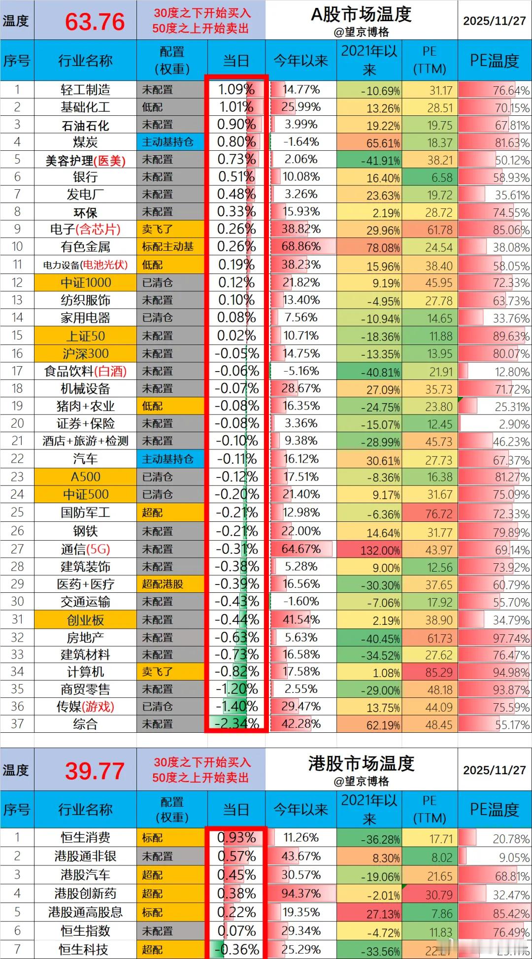 今天净值出来了。场内ETF账户盈利0.2万(资产260万);场外基金账户盈利0.4万(资产550万);两个账户合计盈利0.6万周一盈利7.2万,周二盈利6.2万,周三盈利2.5万,周四盈利0.6万。好的一面是四天持续赚钱了,不好的一面是一天比一天赚的少;本周盈利16.5万,勉强把上周五一天跌的填平。投资赚钱好难啊~A股今天63.76度;港股今天39.77度;博格最近统计ETF资金流向发现:市场跌的时候ETF资金净流入,市场一涨ETF资金就净流出。这个验证市场最近处于横盘震荡的阶段了。没啥大利好(或者利空)的话,大概率震荡到年底了。统计数据不易,大家点赞支持。基金股市a股