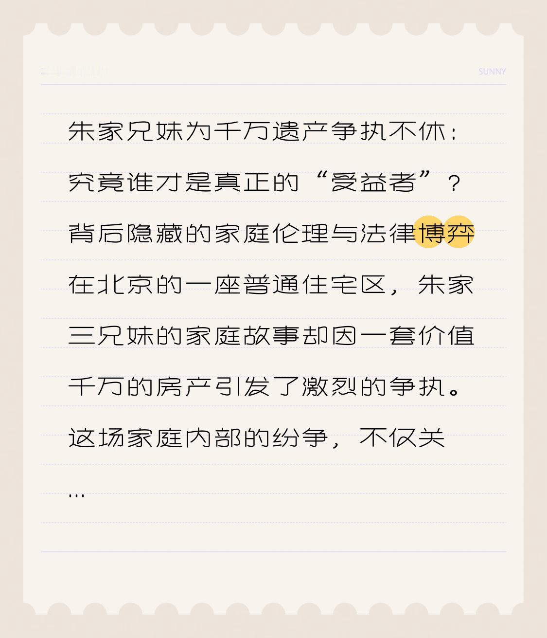 朱家兄妹为千万遗产争执不休:究竟谁才是真正的“受益者”?背后隐藏的家庭伦理与法律博弈 在北京的一座普通住宅区,朱家三兄妹的家庭故事却因一套价值千万的房产引发了激烈的争执。这场家庭内部的纷争,不仅关乎一份遗产的分配,更折射出现代家庭面对财富传承时的复杂情感、伦理观念与法律边界。 父亲去世后,朱家留下了一套价值超过一千万的三居室房产。作为子女,朱老二、朱小妹和大哥都希望得到公平的分配。然而,分歧逐渐升级,家庭关系也变得紧张。 朱老二是家中的二儿子,他认为自己肩负着传宗接代、兴旺家族的责任。于是,他提出了一个分配方案:自己和妹妹各占45%的房产份额,大哥只拿10%。他解释说,这样的分配考虑了自己有后代的因素,体现了对未来的责任感。 但大哥一听,立刻反对。他坚信,遗产的分配应以公平为原则,与子女是否有后代无关。他强调:“遗产应三人平分,公平合理。”他还表示,自己会将应得的份额让给妹妹,以示兄弟情谊。 妹妹朱小妹则更坚决,她拿出父母生前写的“遗嘱”,大声宣称:“我尽到了较多的赡养义务,这房子就该归我。”她的理由是,自己在照顾父母方面付出了更多,理应获得更多的财产。 面对妹妹的强硬态度,朱老二立即质疑遗嘱的真实性。他怀疑遗嘱可能存在问题,担心自己被蒙蔽。同时,他也试图澄清自己并非不孝,只是觉得分配方案不合理。 经过多轮争执,朱老二提出了一个折中的方案:三七分。他建议自己拿30%,剩下的70%由大哥和妹妹平分。同时,他还希望妹妹整理父母的存款,将存款也一并公平分配。 妹妹朱小妹对这个方案表示还可以接受,但对于父母存款的具体分配,她心里仍有犹豫。毕竟,她对存款的具体数额并不清楚,也觉得自己在赡养父母方面付出更多,理应得到更多。 这场家庭纷争,反映了现代家庭在面对遗产分配时的普遍难题。法律上,第一顺序继承人包括配偶、子女和父母。朱家三兄妹作为子女,都是第一顺序继承人,法律并不考虑子女是否有后代这一因素。 那么,究竟谁才是真正的“受益者”?答案或许不止于法律的公平,更关乎家庭成员之间的情感、责任与伦理。 实际上,遗产分配不仅仅是财产的划分,更是一场家庭关系的考验。合理的沟通、尊重彼此的付出、依法行事,才是解决家庭财产纷争的根本之道。 这起事件也提醒我们:在财富传承面前,家庭成员应提前做好沟通和规划,避免因误解和偏见而破坏家庭和睦。毕竟,家庭的温暖和睦,远比一份遗产更为珍贵。 家庭财产的争夺,既是法律的角力,也是情感的博弈。只有在尊重法律、理解彼此的基础上,才能实现真正的公平与和谐。朱家的故事,或许只是千千万万个家庭中的一个缩影,但它所折射出的家庭伦理和法律思考,却值得每一个人深思。家庭遗产之争 姐弟争财产