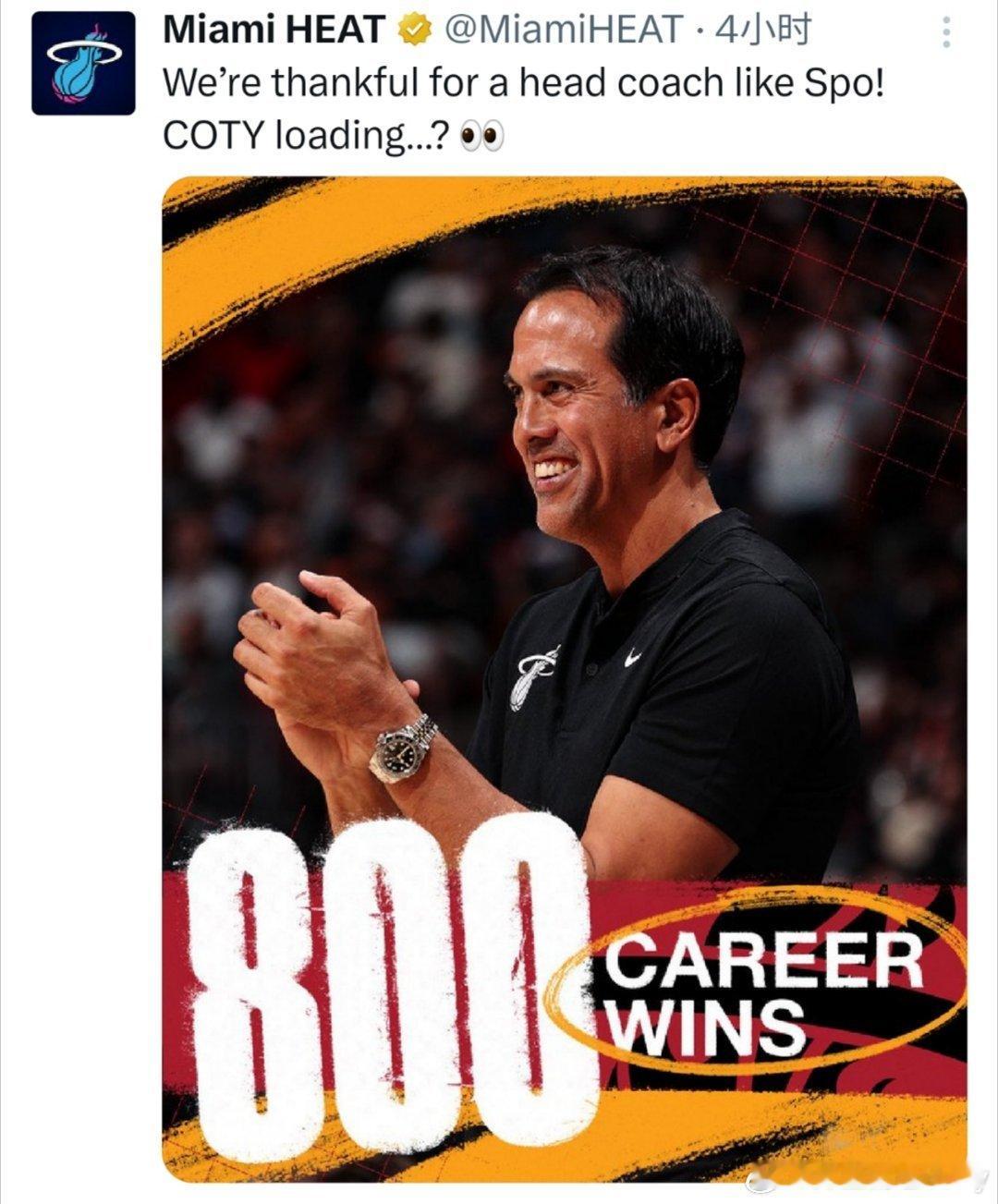 热火官媒晒照庆祝斯波执教第800胜,并配文:我们感谢拥有斯波这样的主教练!年度最佳教练即将载入中....?👀科尔“接班人”斯波,目前带领热火豪取6连胜,热火13胜6负排名东部第三。