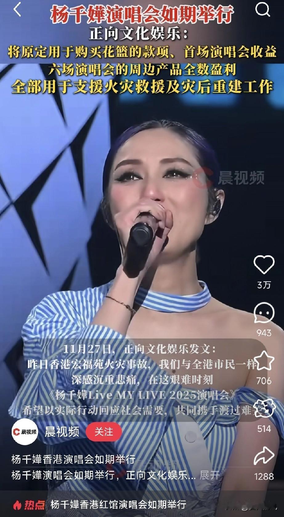 杨千嬅演唱会, 撞上香 港火灾, 瞬间被推上风 口 浪 尖。 有人说她冷血,也有人理解她的难处。其实想想,演出不是庆典,而是工作。 场馆、票务、外地观众行程,哪一样不是提前数月定下的?退了演出,损失谁来扛? 生活不是非黑即白,有人在灾 难中坚持秩序,不代表心中没有悲悯。 她将部分收入捐出,难道不算一种更实际的支持?