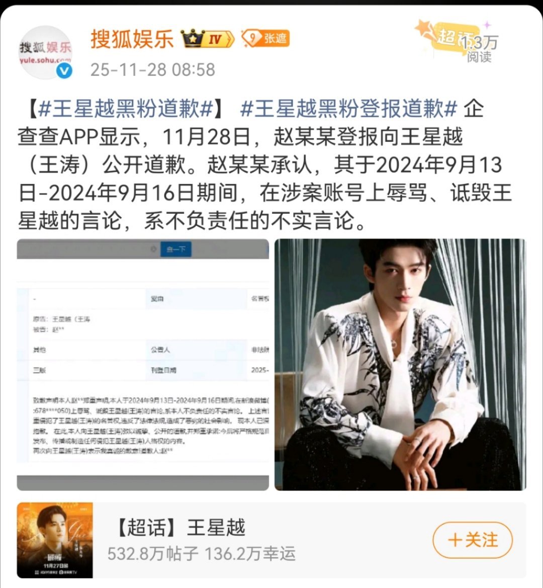 王星越黑粉登报道歉,承认其于2024年9月13日-2024年9月16日期间,在涉案账号上辱骂、诋毁王星越的言论,系不负责任的不实言论。