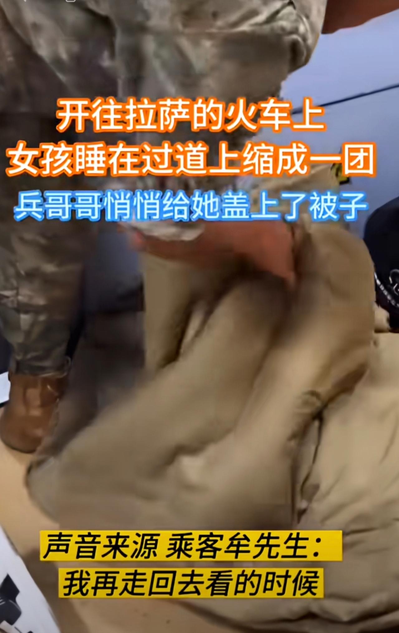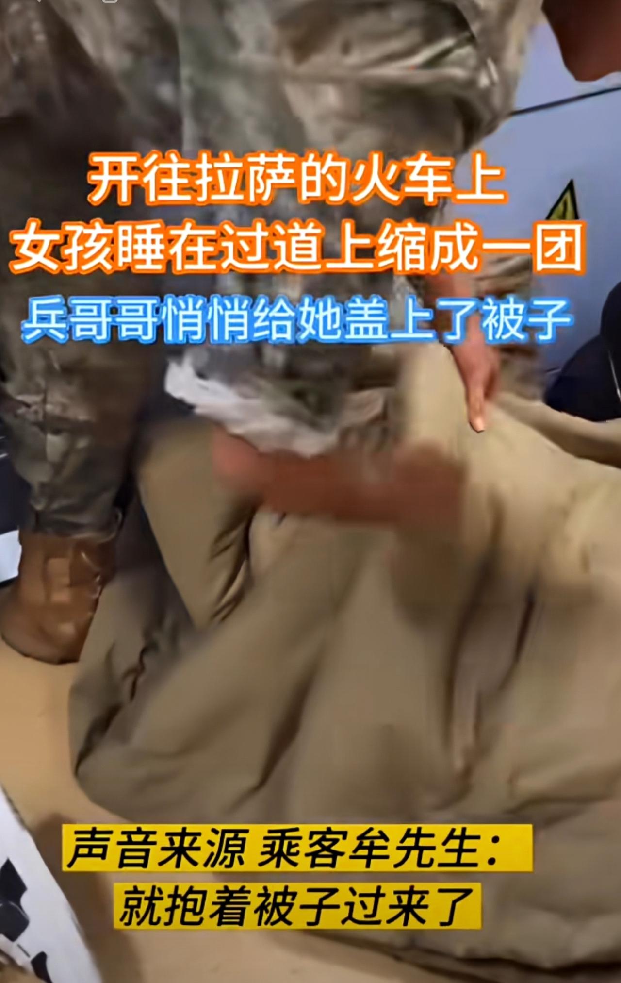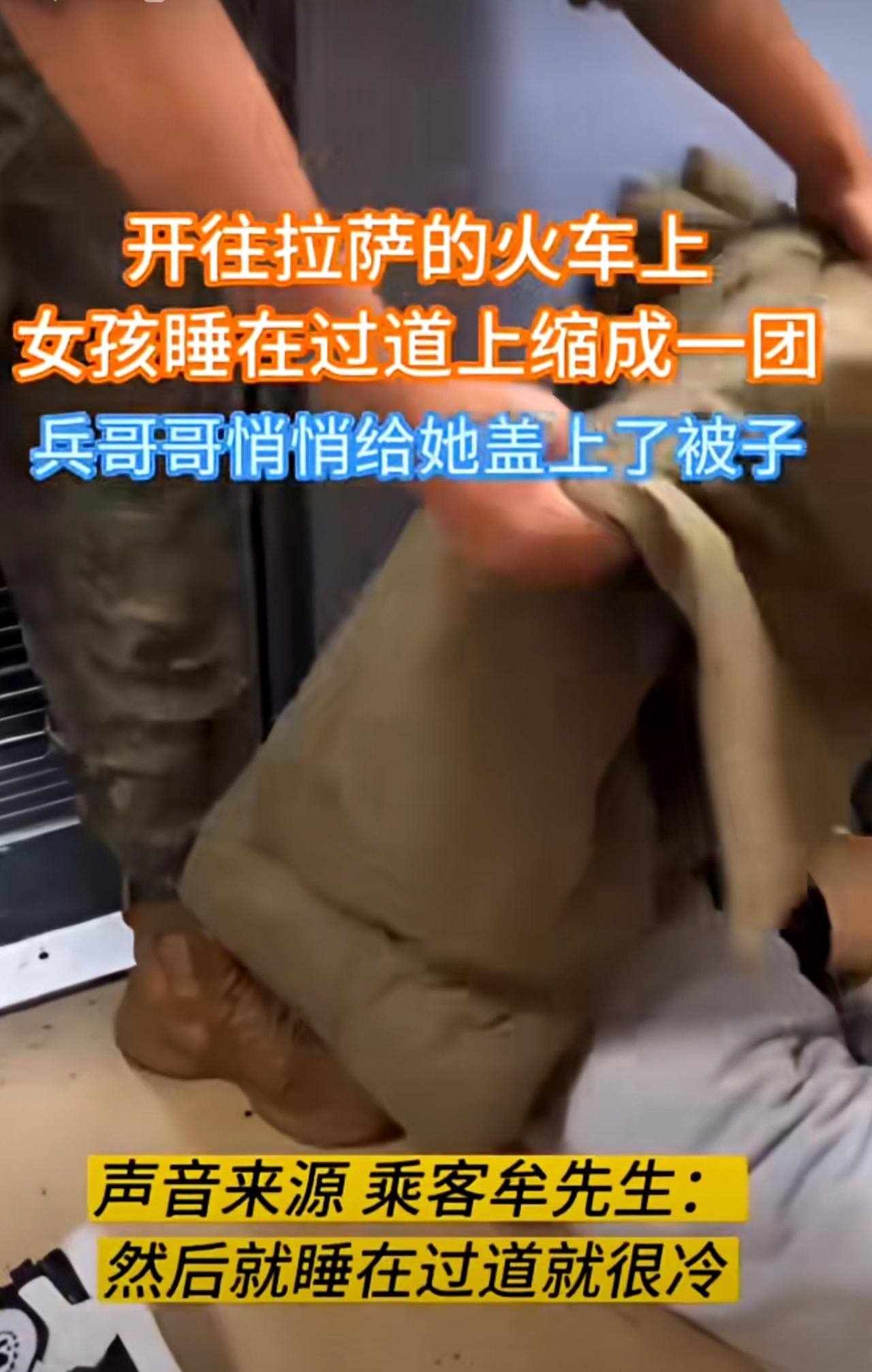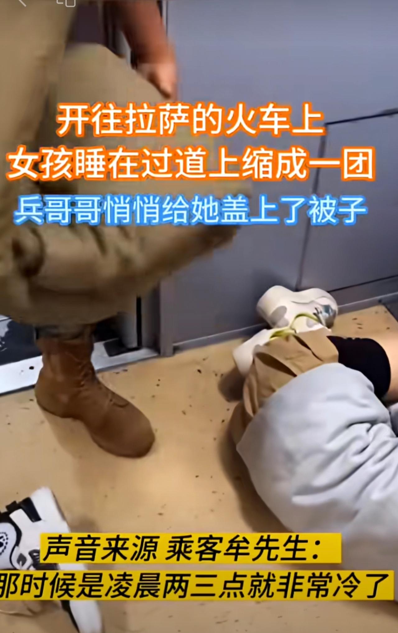 火车上,女孩睡在过道上缩成一团,兵哥哥悄悄给她盖上了被子。