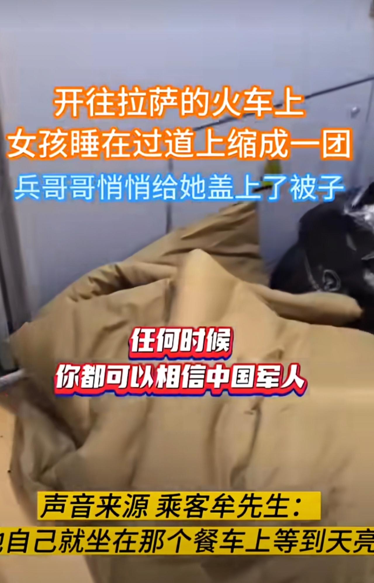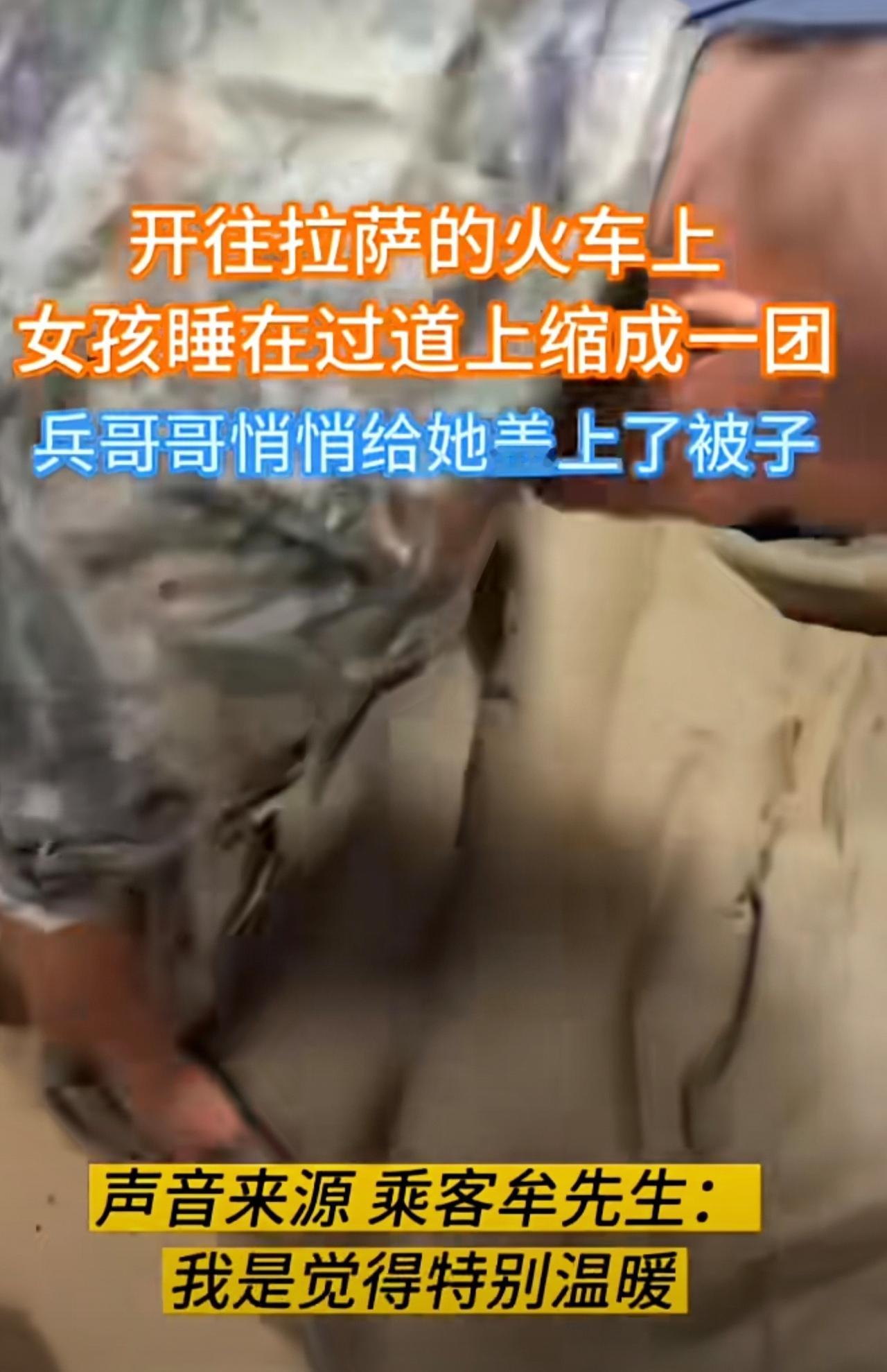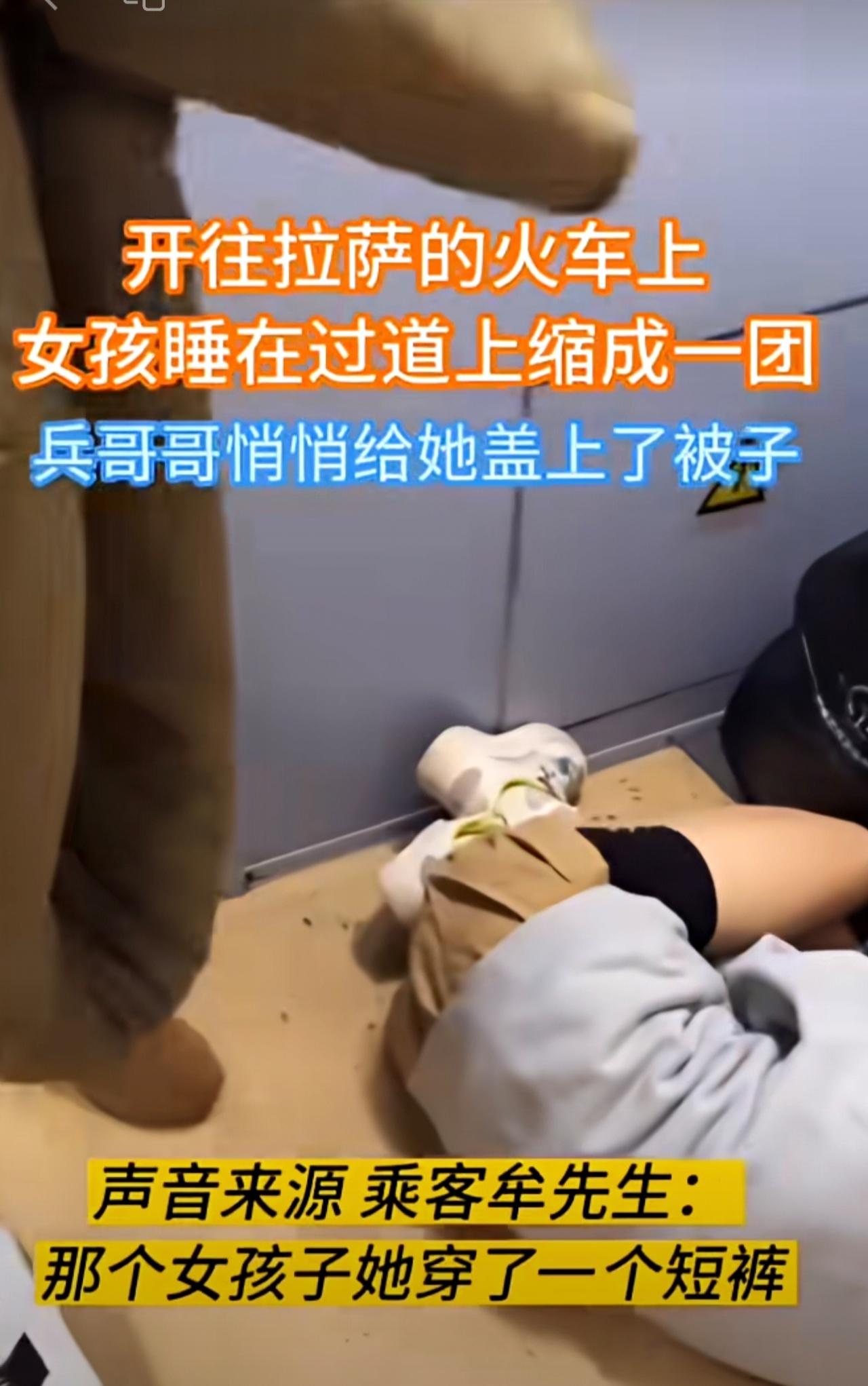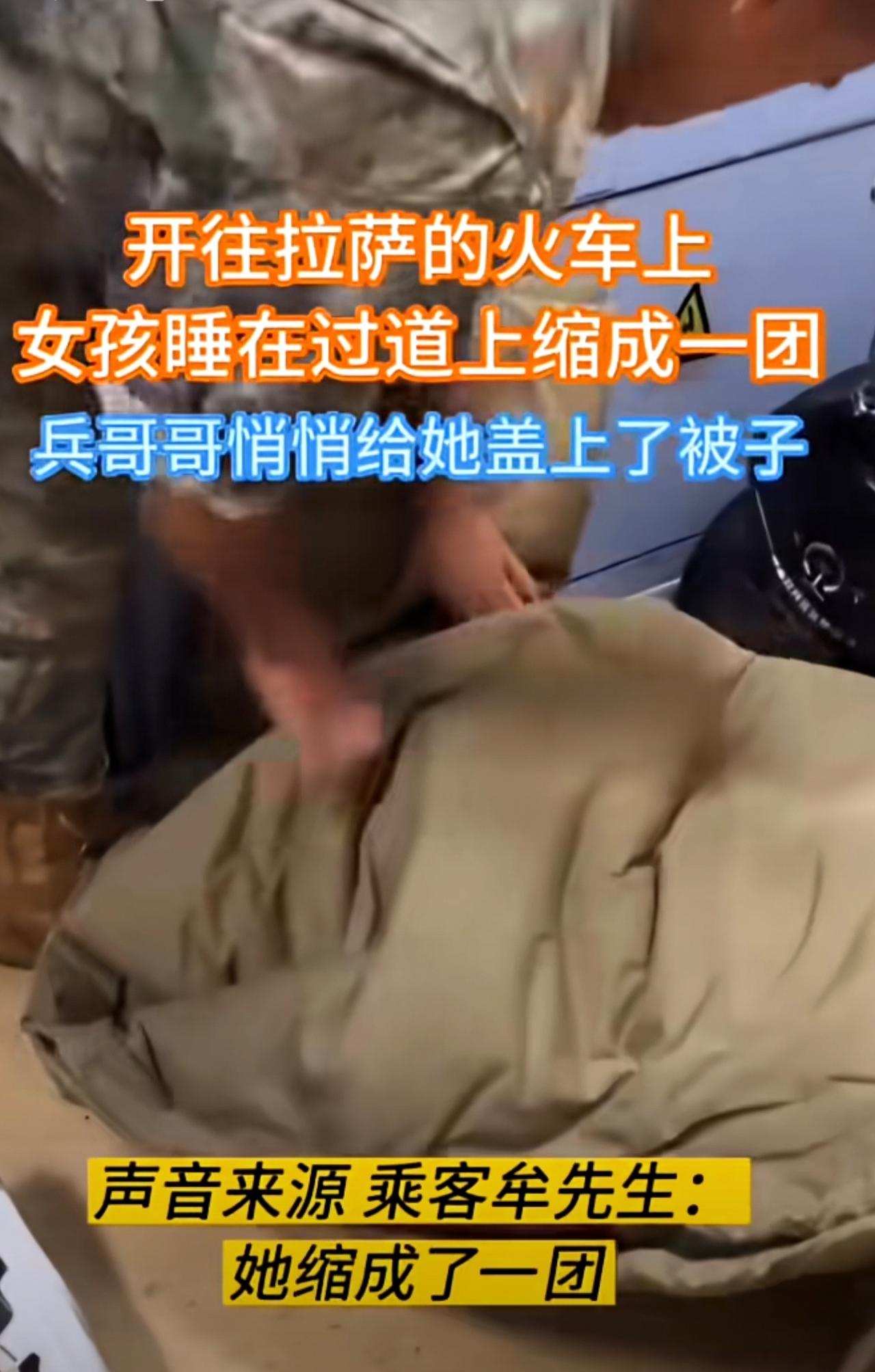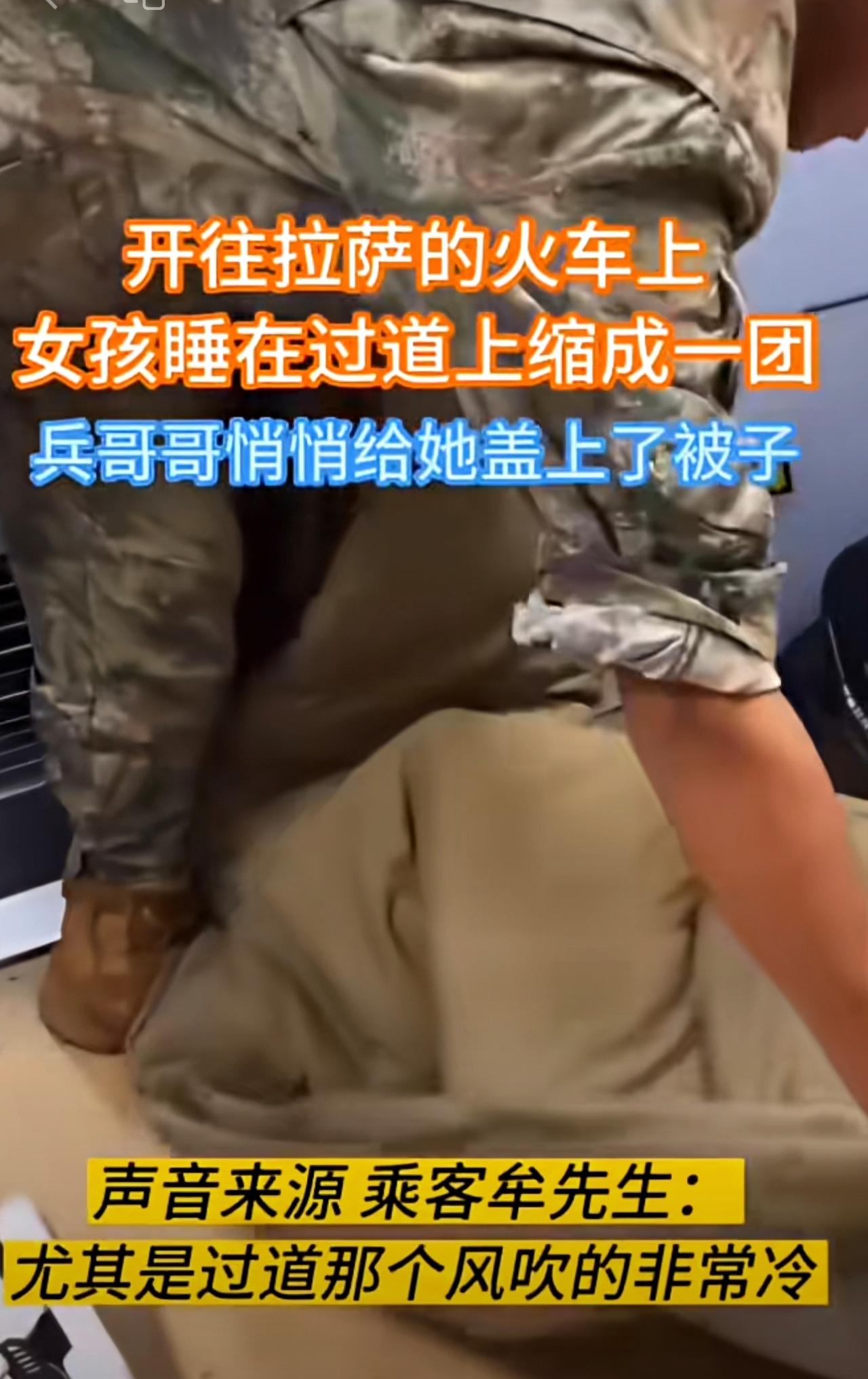 火车上,女孩睡在过道上缩成一团,兵哥哥悄悄给她盖上了被子。
