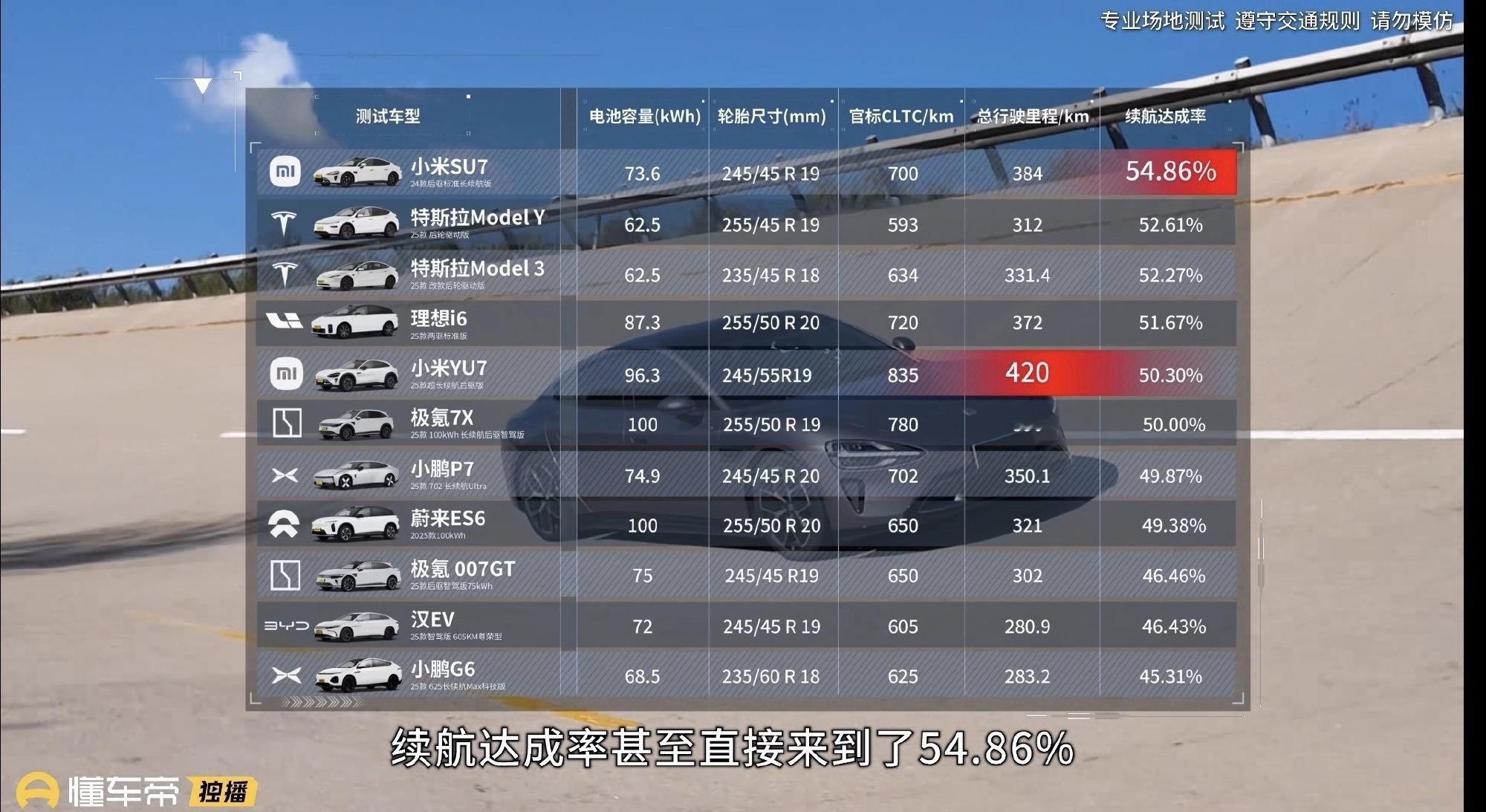 电车续航焦虑很大一部分的来源在高速上,所以说高环测试才是真·照妖镜!这次懂车帝采用了120km/h匀速+满载375kg+动能回收最低+空调常开的地狱工况。拼的就是电控、风阻和能量管理的硬实力。结果小米直接包揽双冠!YU7狂跑420公里拿下21款车续航第一,SUV能有这高速耐力真的离谱。SU7更狠,54.86%的续航达成率甩下两款特斯拉,在达成率不足50%成常态的测试里稳坐头把交椅,73.6度电池跑出的成绩堪比大电池车型,能耗管理是真的顶。之前汽车之家准冬测就看出小米的功底,现在高环测试再次印证实力,难怪SU7连续10个月销冠、YU7登顶SUV销量第一,用户用钱包投票的背后,全是实打实的产品力支撑!雷总说中国车企还要继续努力,但这波硬刚的成绩,已经让我们看到了中国品牌的底气。雷军回应小米汽车续航测试