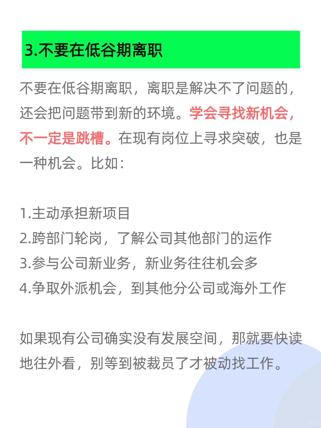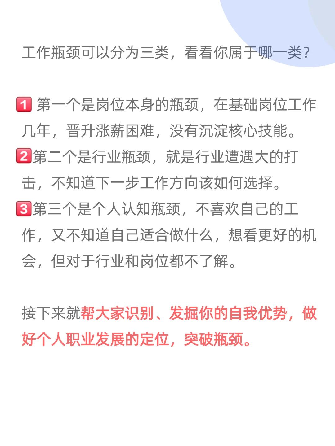 作遇到瓶颈期、干不下去了,怎么办? 工作瓶颈可以分为三类,看看你属于哪一类? 👉第一个是岗位本身的瓶颈,在基础岗位工作几年,晋升涨薪困难,没有沉淀核心的技能。 👉第二个是行业瓶颈,就是行业遭遇大的打击,不知道下一步工作方向该如何选择。 👉第三个是个人认知瓶颈,不喜欢自己的工作,又不知道自己适合做什么,想看更好的机会,但对于行业和岗位都不了解。 接下来就帮大家识别、发掘你的自我优势,做好个人职业发展的定位,突破瓶颈。 1️⃣首先思考这份工作适不适合自己 我们一定要去考虑一下:这份工作到底是适不适合我们。 可能因为你做的这份工作不适合你,或者说是你不擅长、不喜欢的内容,才会导致你在这个工作当中做不好,遇到瓶颈。 这个时候我们不是盲目地去努力,而是说停下来思考一下什么事情才是适合我们的。 2️⃣重新定位,找准自己的核心竞争力 面临上述三个困境,这时候需要停下来,好好梳理一下自己的优势和不足。 每个人都有自己的长板,关键是要认清发挥它,同时也要正视短板,比如以前最怕项目策划汇报,那就花多时间恶补这块,时间久了虽说不上多厉害,起码不会遇到问题就想离职。 接下来就要思考:现在的公司最需要什么样的人才?行业发展趋势是什么?把自己的经历跟公司、行业的需求结合起来,找到适合的定位和发展方向,在新的赛道转型。 3️⃣不要在低谷期离职 不要在低谷期离职,离职是解决不了问题的,还会把问题带到新的环境。学会寻找新机会,不一定是跳槽。在现有岗位上寻求突破,也是一种机会。 如果现有公司确实没有发展空间,那就要快读地往外看,别等到被裁员了才被动找工作。 4️⃣制定行动目标 根据自己的分析和探索,确定一个明确的职业目标。这个目标要具体、可衡量、可实现、有时间限制。 比如,在未来一年内,提升自己的 [具体技能],争取晋升到 [具体职位] 或者转行到 [具体行业]。 有了目标,现在遇到的职业瓶颈就不算什么了!
