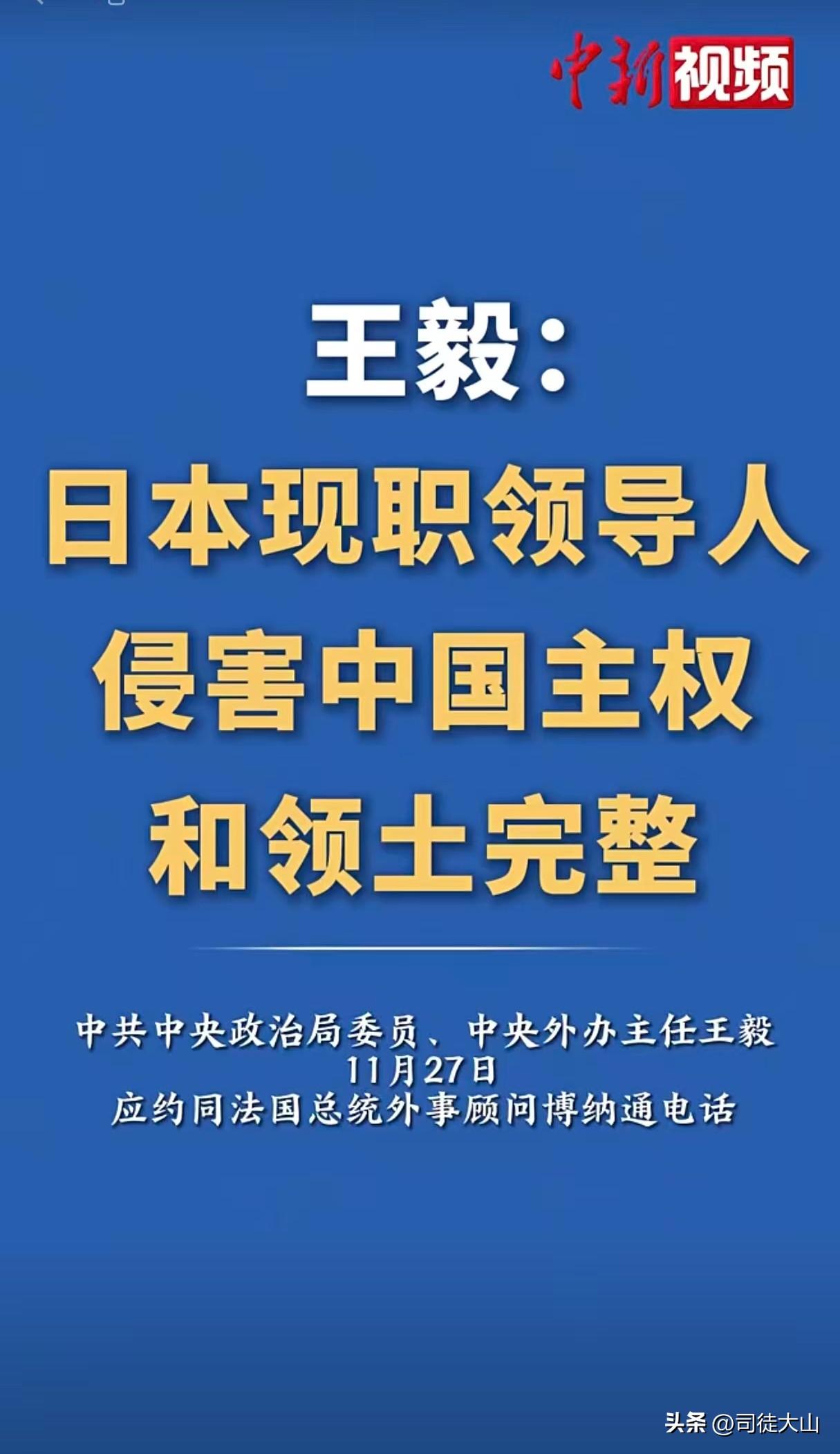 【王毅外长直接定性为“侵害主权和领土完整!有侵害必有反抗】 日本首相高市早苗屡次发表涉台错误言论,公然挑战一个中国原则,王毅外长在与法国总统外事顾问博纳通电话时,对其行为进行了直接定性,指出其言论“公然开历史倒车,侵害中国主权和领土完整”。 有侵害必有反抗,这是国际关系的铁律! 中方已划出三条不可逾越的红线:绝不允许任何国家损害中国主权和领土完整;绝不允许破坏东亚和平稳定;更绝不允许日本重走军国主义老路。王毅外长严正警告:“如果日方一意孤行、一错再错,一切主张正义的国家和人民,都有权利对日本的历史罪行进行再清算!” 这既是对日本现职领导人的当头棒喝,也是对国际社会的庄严宣告——中国维护国家统一的意志坚如磐石,任何外部势力若执意挑衅,必将为其侵害行径付出沉重代价! 历史不会重演,但会惩罚健忘者。 有侵害必有反抗,这是对主权尊严的捍卫,更是对人类良知和国际和平秩序的守护!中国军方已经密集发出严厉警告,公然侵害中国主权和领土完整的日本及其领导人下场如何,拭目以待! 来源:中国新闻网