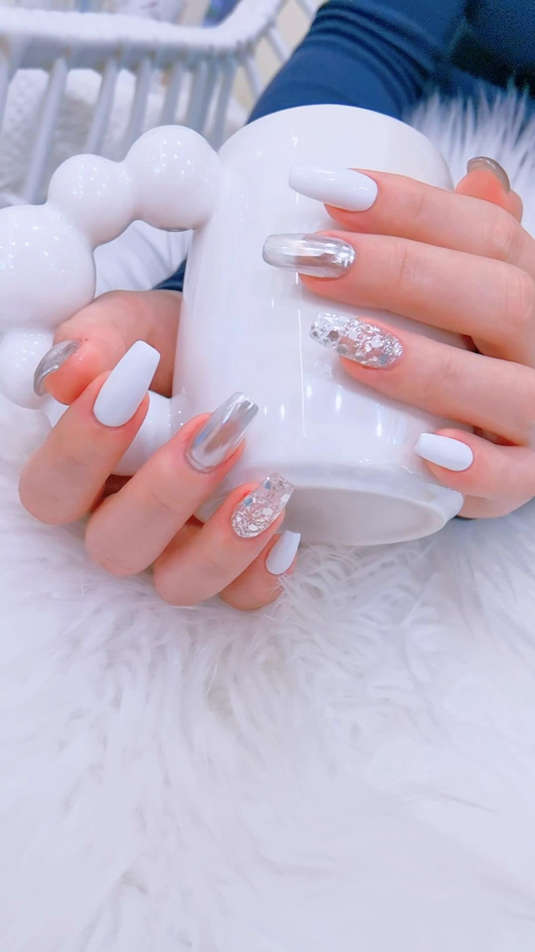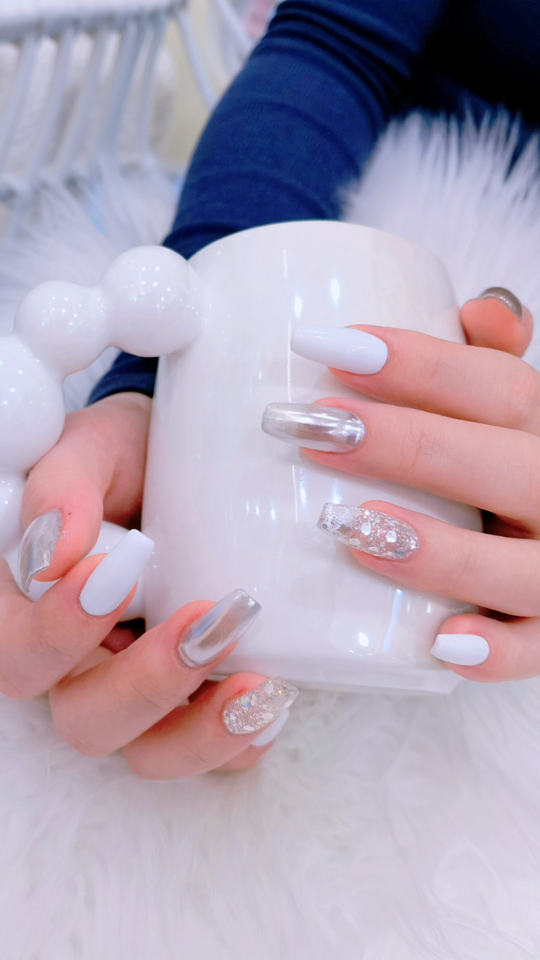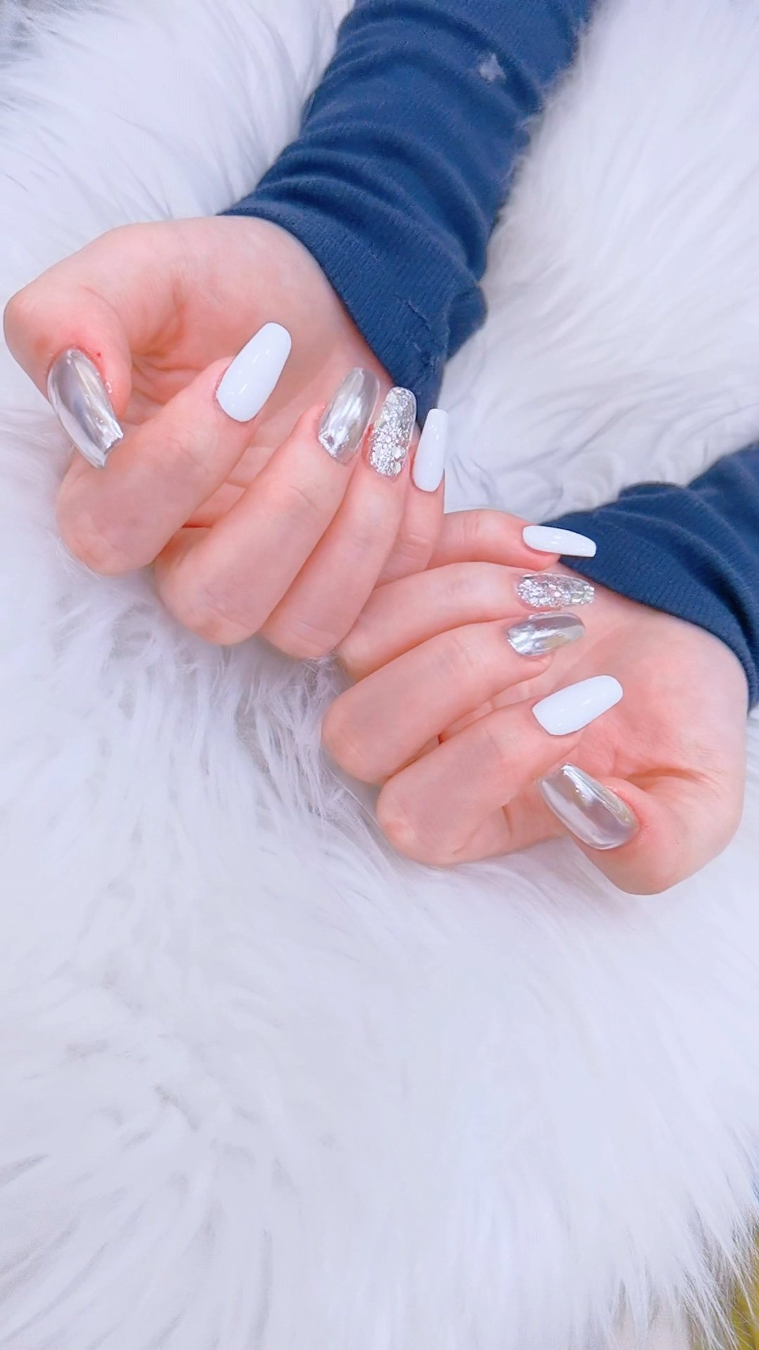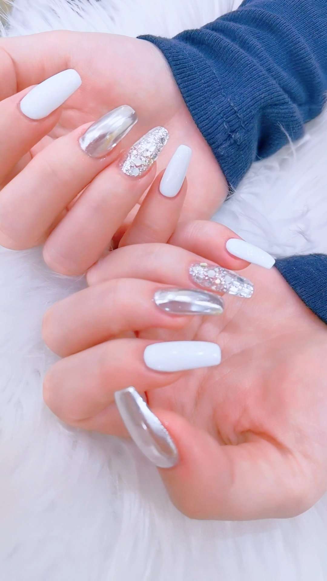 谁说冬天只能沉闷?我的指尖已经提前下了一场✨银色暴雪! ✨【魔镜银】的流光溢彩,是科技与美的碰撞! ✨【银色闪片】的璀璨夺目,是夜空中最亮的星! ✨【纯白跳色】的干净利落,是冬日初雪的纯粹! 拇指和中指,用【魔镜粉】打造出镜面般的未来感,每一次转动都折射出迷人的光彩。无名指则铺满了细腻的【银色闪粉】,仿佛将银河的星光都收集在了指尖。食指和小指的【纯白跳色】,如同冬日初雪,纯净又高级,完美平衡了整体的华丽感。 走在街上,抬手间都是闪耀的焦点,感觉自己就是冬日里最靓的崽! 这个冬天,让我们一起用指尖的银河,点亮整个季节吧!💫 美雅美学 人气美甲美睫店推荐 客照分享 每日分享 日常分享