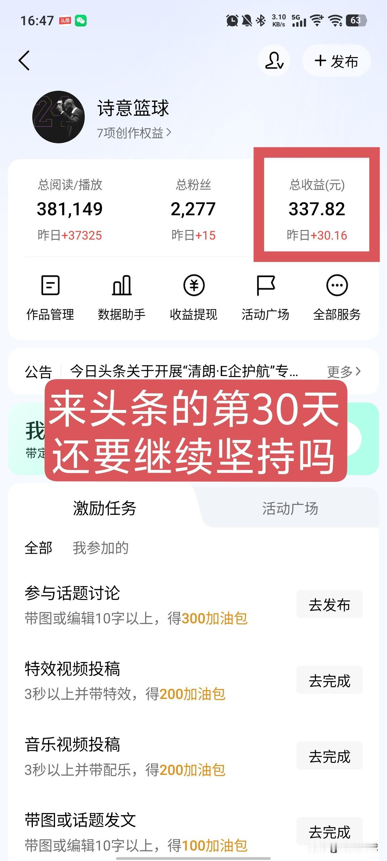 来头条正式的第30天 还要继续坚持吗 以前是随便发没有很在意 现在是每天都在不停的发文章 看到大神说得持续性坚持 现在坚持了一个月 每过半个小时都会看一眼播放量 每天最少会发10-15个文章 真的花了很多的心思 目前的结果是好还是不好 有没有同行给点建议 看到别人一天挣个大几百 心里还是很不甘 期待有缘人给到真实的建议