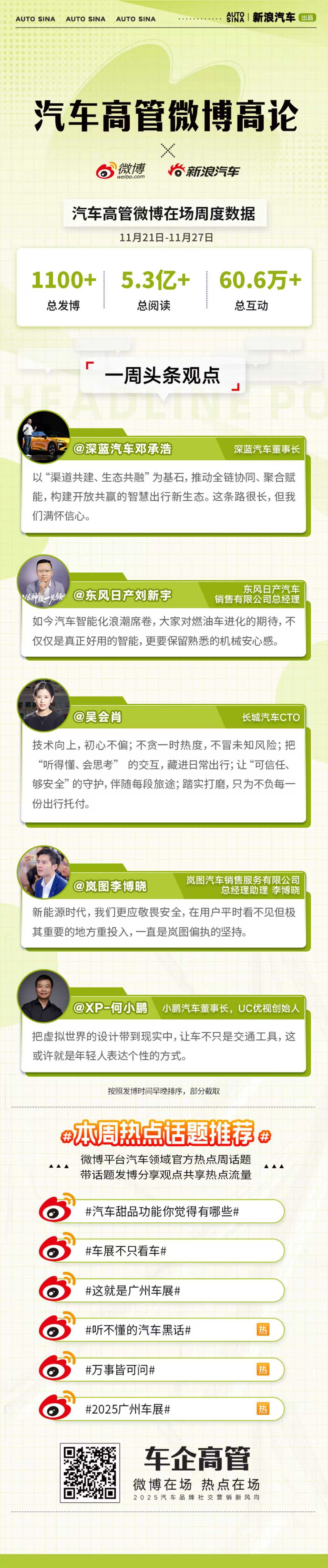 以科技赋能出行,让智能更可感、安全更可靠、个性更鲜明。汽车高管微博高论,省流速览微博一周高管精彩观点!