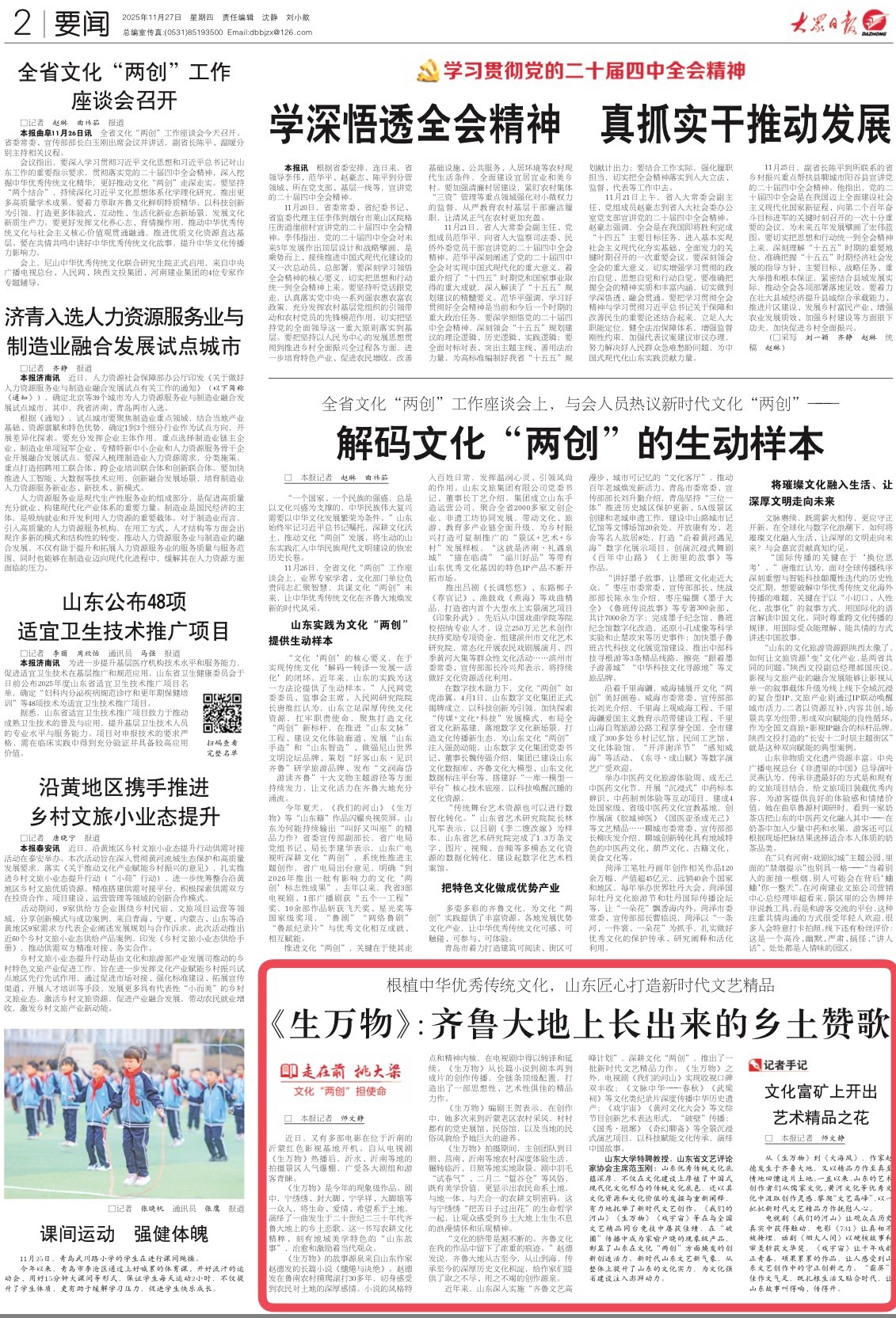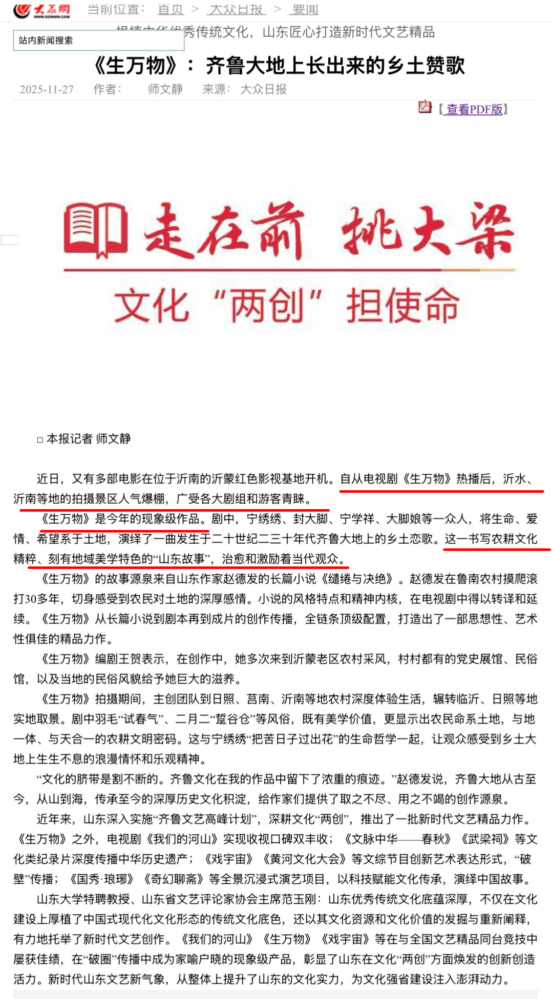 杨幂生万物 又登报纸啦!👏中共山东省委机关报(我国报业史上连续出版时间最长的党报)《大众日报》11月27日刊登要闻——《生万物》:齐鲁大地上长出来的乡土赞歌文中写道:从电视剧《生万物》热播后,沂水、沂南等地的拍摄景区人气爆棚,广受各大剧组和游客青睐。《生万物》是今年的现象级作品。书写农耕文化精粹、刻有地域美学特色的“山东故事”,治愈和激励着当代观众。杨幂宁绣绣