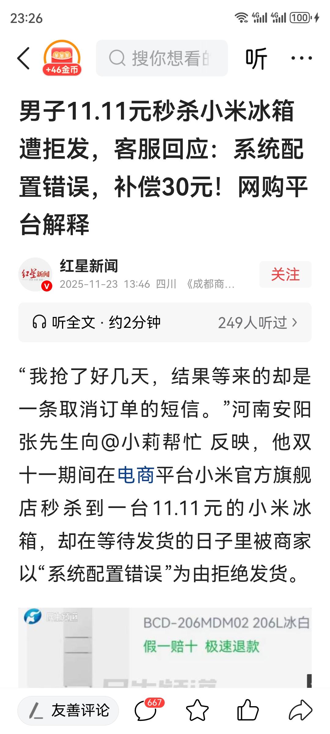 小米这又上新闻,11.11元秒杀小米冰箱,结果等来取消订单,和30元优惠券补贴。理由是“系统配置错误”这真不是黑小米,按照客服说法,那也是卖家的错误,关买家什么事。难道不是把冰箱发货,然后找到错误的责任人嘛。这不是典型的玩不起嘛?难道被秒杀的不止一台?这个操作真的没有看明白。