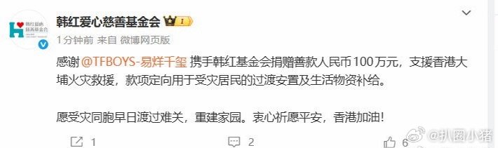 易烊千玺捐款100万元驰援香港!愿受灾同胞早日渡过难关,重建家园。衷心祈愿平安,香港加油! 易烊千玺向香港捐款100万
