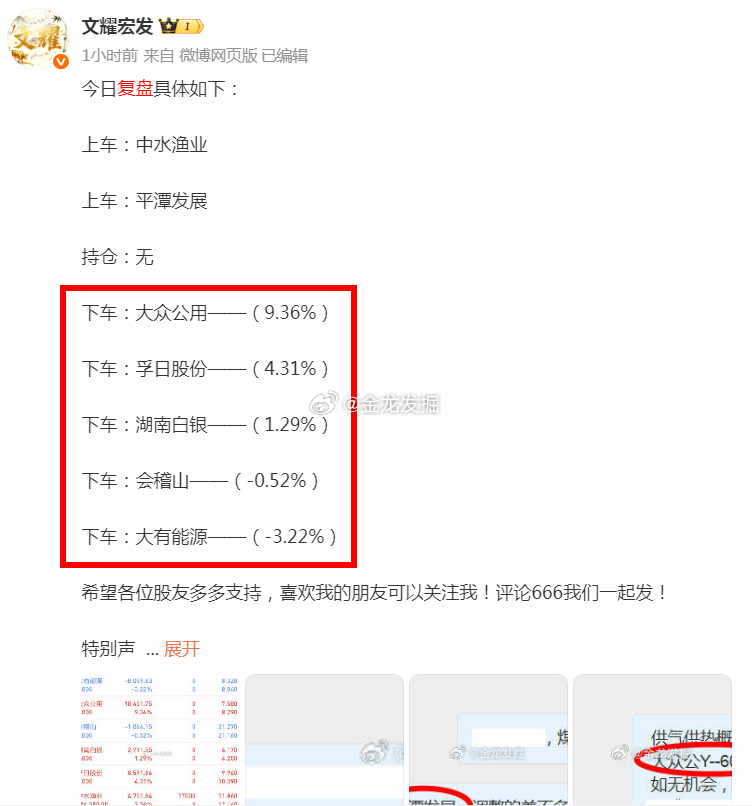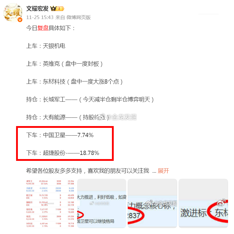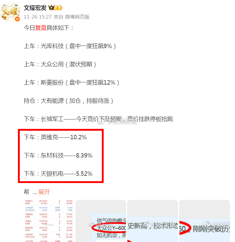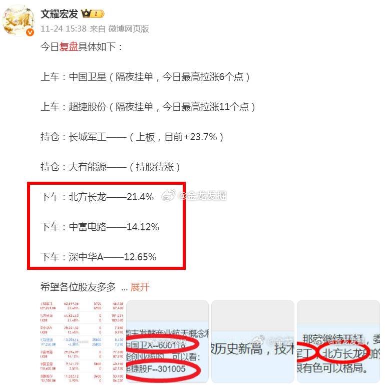 本周入袋标的回顾:周一下车 :$北方长龙 sz301357$——21.4%$中富电路 sz300814$——14.12%$深中华A sz000017$——12.65%周二下车:$中国卫星 sh600118$——7.74%$超捷股份 sz301005$——18.78%周三下车:$英维克 sz002837$——10.2%$东材科技 sh601208$——8.39%$天银机电 sz300342$——5.52%周四下车:$光库科技 sz300620$——18.27% $斯菱股份 sz301550$——10.43%周五下车:$大众公用 sh600635$——9.36%$孚日股份 sz002083$——4.31%$湖南白银 sz002716$——1.29%$会稽山 sh601579$—— -0.52%$大有能源 sh600403$—— -3.22%本周涨停标的回顾:周一长城军工、周二英维克、周四孚日股份、周五平潭发展相继封板。虽然基本维持了每日都有涨停标的节奏,但连板难度显著加大,多数个股呈现“隔日破板”特征。与上周相比,本周操作难度明显提升,今日已果断清仓处理,仅轻仓布局两只消费股。十一月行情充满挑战,衷心感谢各位伙伴的持续关注与支持。让我们共同期待十二月市场能够迎来更友好的环境,愿新的月份投资顺利,再创佳绩!财经股票今日盘面分析