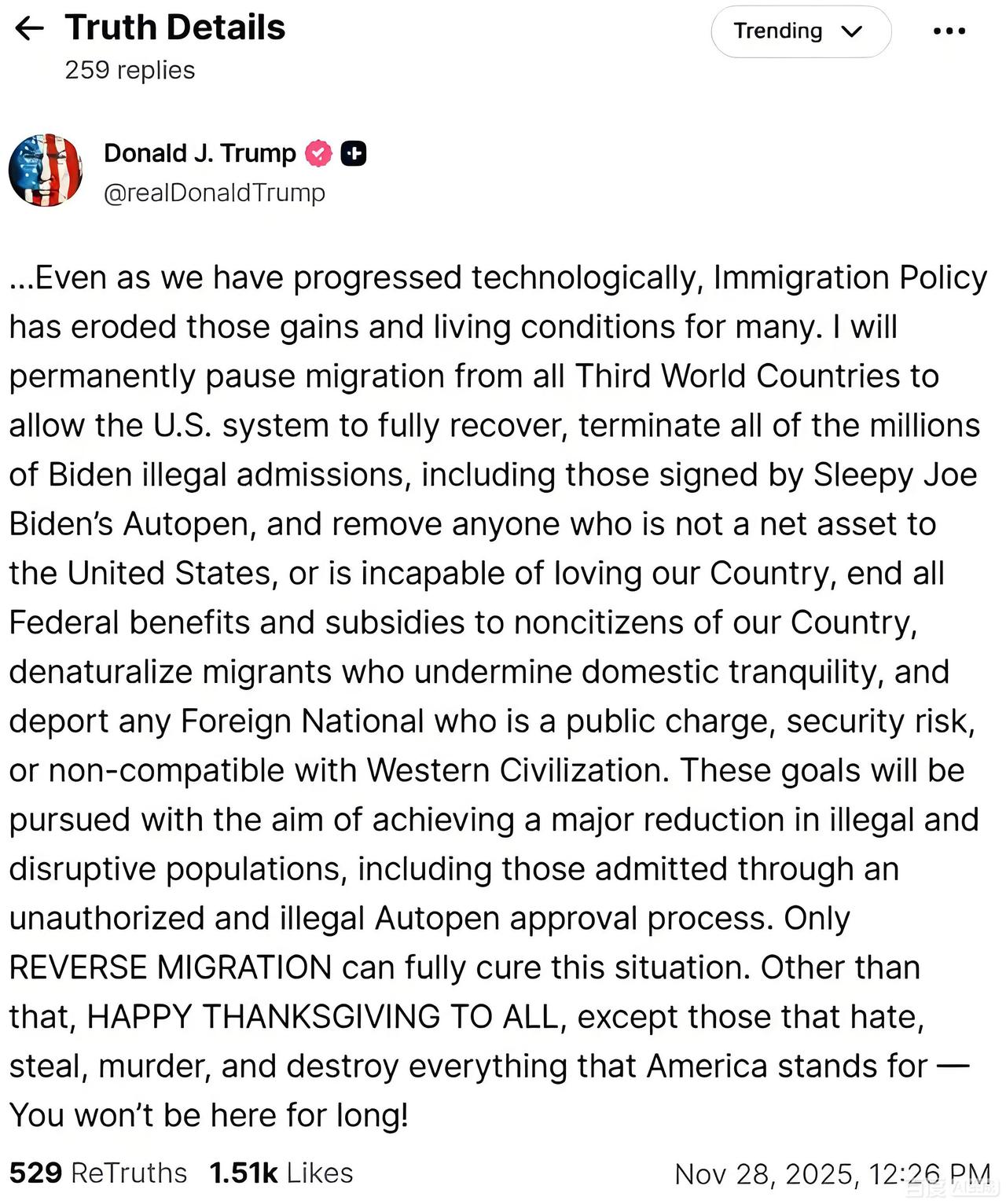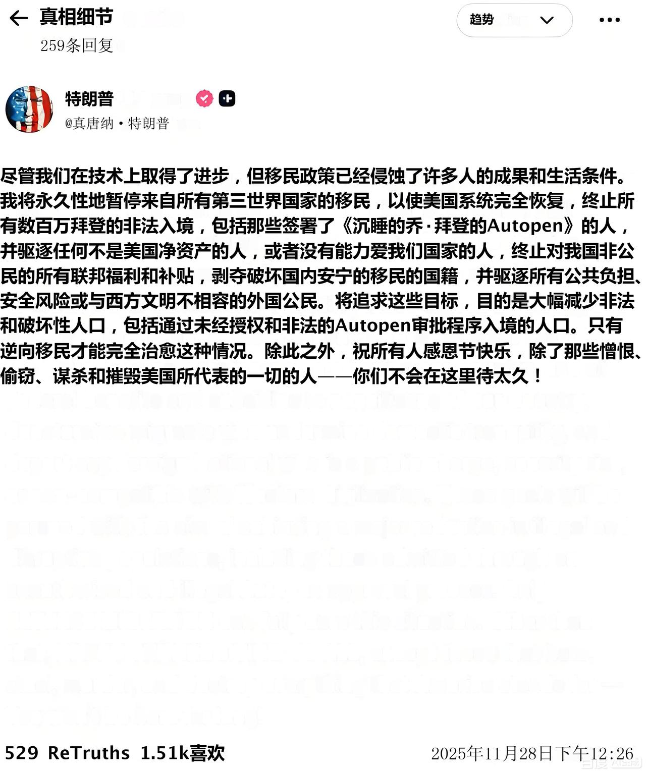 特朗普:将永久暂停来自第三世界国家的移民入境 根据多家主流媒体报道,美国总统唐纳德·特朗普于2025年11月27日晚(感恩节)在Truth Social平台上发布长帖,宣布将“永久暂停来自所有第三世界国家的移民”,以“让美国系统完全恢复”。 这一声明是在华盛顿特区发生枪击事件后迅速发布的,该事件导致一名国民警卫队成员死亡,嫌疑人是一名阿富汗移民。这被视为特朗普第二任期内移民政策的进一步收紧,引发广泛争议。 11月27日,一名29岁的阿富汗国民在白宫附近枪击两名国民警卫队成员,一人死亡,另一人重伤。嫌疑人于2021年9月以人道主义假释身份入境美国,其庇护申请于今年早些时候在特朗普政府期间获批。 特朗普将事件归咎于前总统拜登时期的移民政策,指责其导致“数百万非法入境”。他承诺启动“逆向移民”计划,包括终止拜登时代的所有移民批准、取消非公民联邦福利,并驱逐“公共负担、安全风险或与西方文明不相容”的外国人。 “第三世界国家”定义:特朗普未明确列出具体国家,但该术语通常指发展中国家或经济不稳定、高贫困率地区(如非洲、拉丁美洲和部分亚洲国家)。这可能影响数百万潜在移民,包括工作、教育和逃避迫害者。