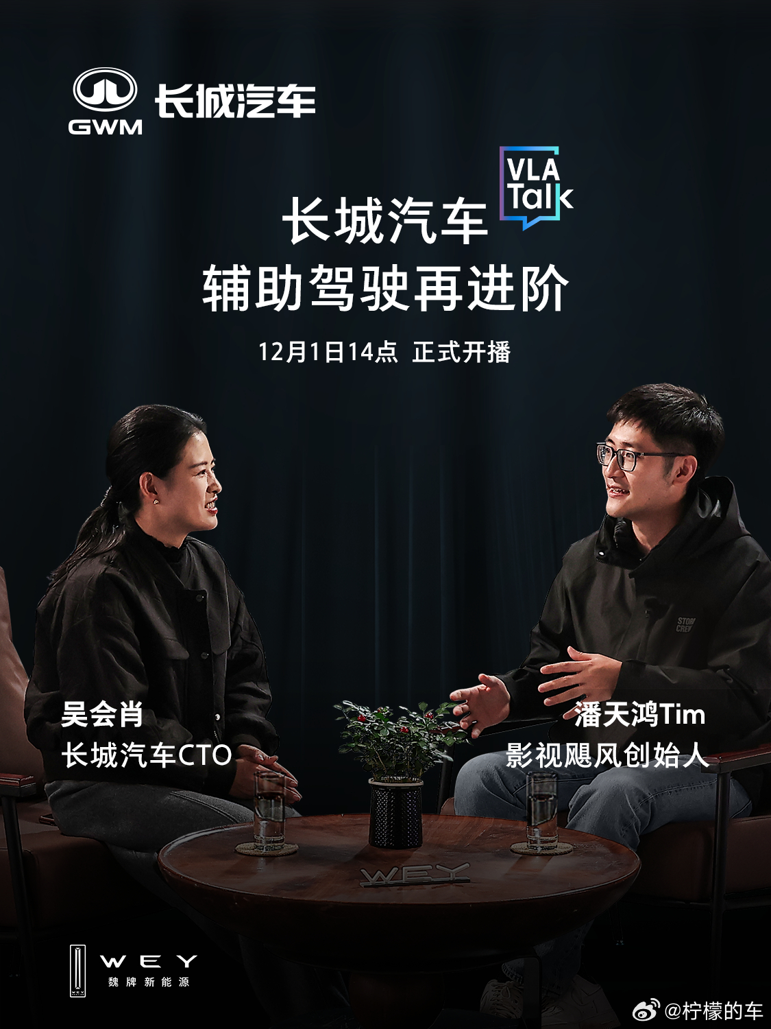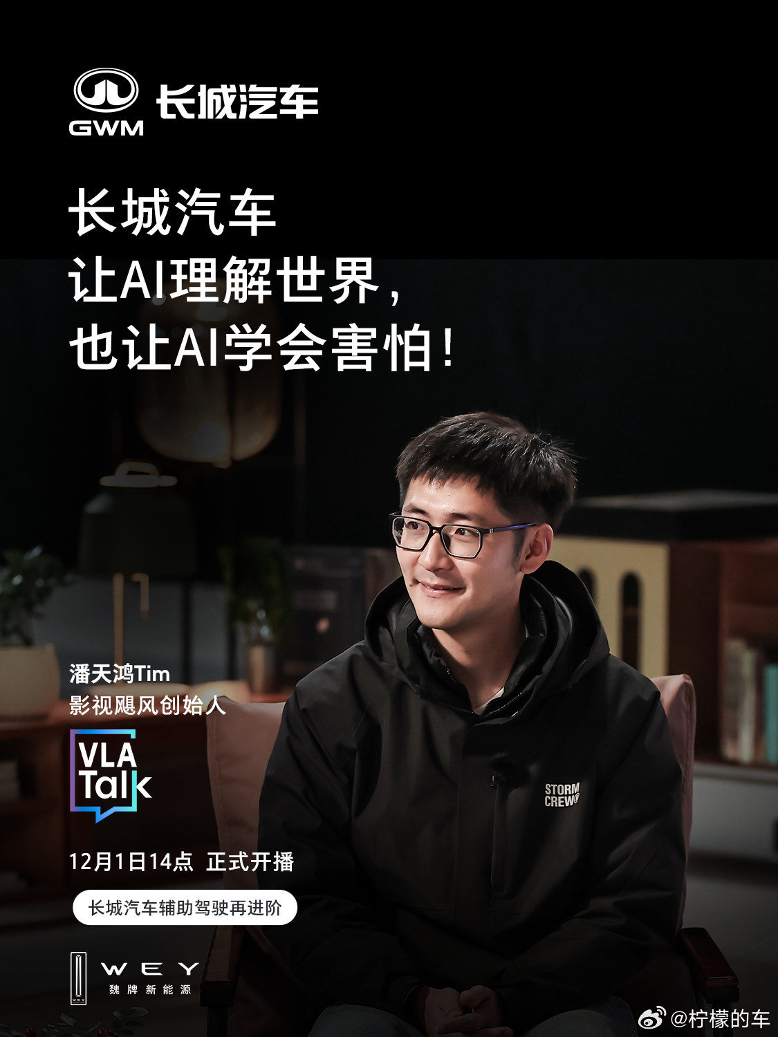 一直觉得跨界对话最有看头,当深耕影像科技的影视飓风Tim,遇上玩转汽车技术的长城汽车CTO吴总,这对话内容很难不让我感兴趣作为全网首个体验长城汽车VLA的人,Tim的反应真的很真实。说实话,现在车企搞新技术总爱堆参数,但VLA首搭魏牌蓝山,能让用户实实在在感受到的升级12月1日14:00 VLA Talk正式上线,真想听听Tim和吴总深入聊聊技术背后的逻辑,看看这款让科技大V都震惊的VLA,到底有啥真东西长城汽车VLA首搭魏牌蓝山