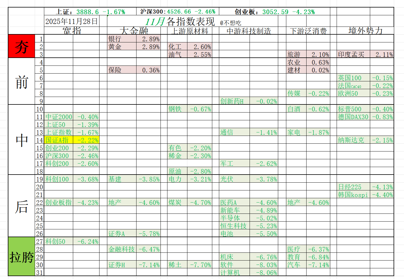 2025年11月指数表现一览表。本月涨幅超过2%就是夯,本月跌幅小于1%的就是前列。本月跌幅-1%--3%的属于中部区间。本月跌幅大于6%的为表现拉垮。11月结束,12月即将开始。注:境外指数数据还有一个交易日,所以最终数据可能会有偏差。