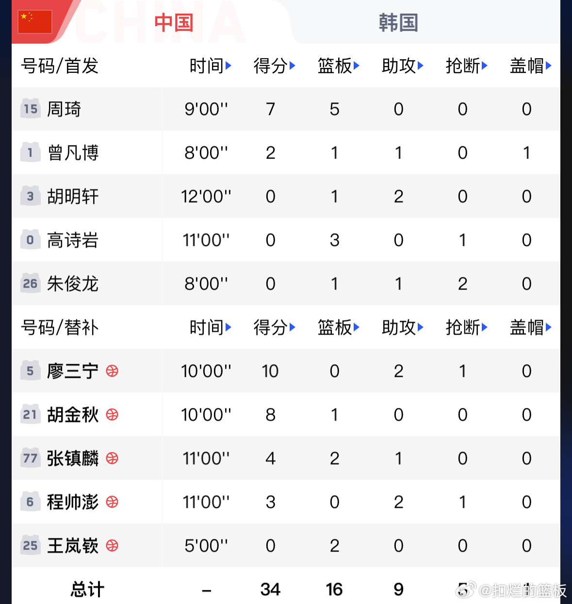 半场结束!中国男篮34-47暂时落后!韩国球员李贤重表现出色拿下20分!投篮9中